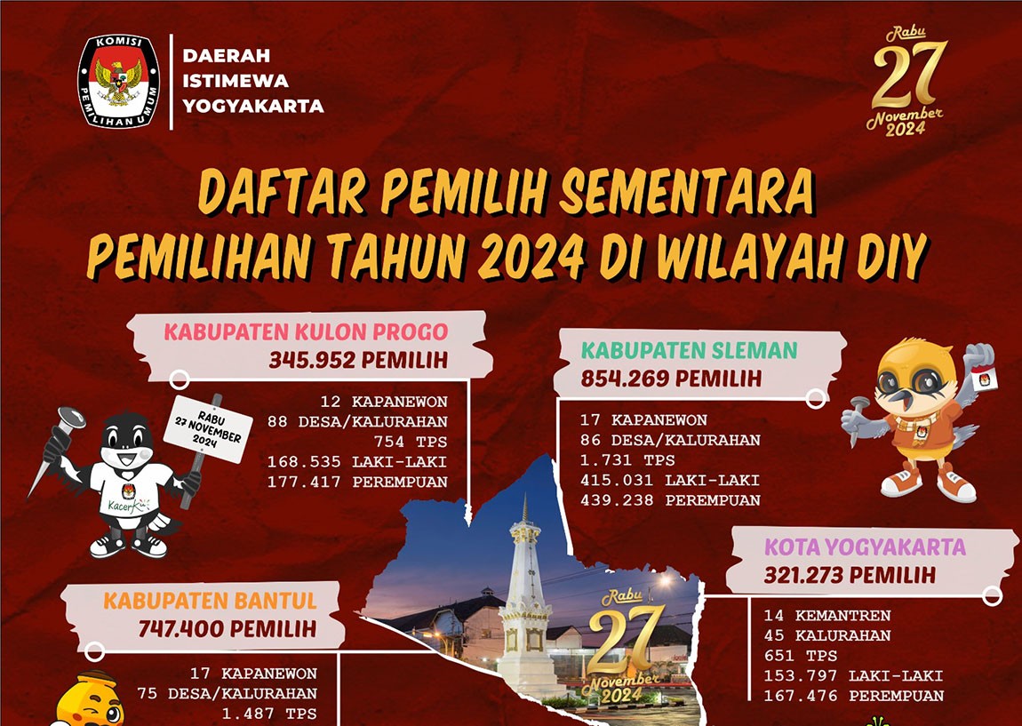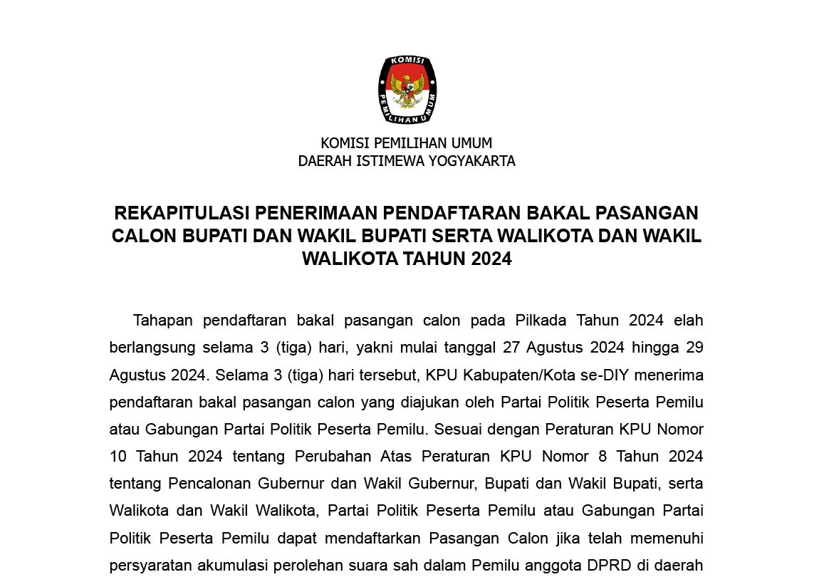 Tahapan pendaftaran bakal pasangan calon pada Pilkada Tahun 2024 elah berlangsung selama 3 (tiga) hari, yakni mulai tanggal 27 Agustus 2024 hingga 29 Agustus 2024. Selama 3 (tiga) hari tersebut, KPU Kabupaten/Kota se-DIY menerima pendaftaran bakal pasangan calon yang diajukan oleh Partai Politik Peserta Pemilu atau Gabungan Partai Politik Peserta Pemilu. Sesuai dengan Peraturan KPU Nomor 10 Tahun 2024 tentang Perubahan Atas Peraturan KPU Nomor 8 Tahun 2024 tentang Pencalonan Gubernur dan Wakil Gubernur, Bupati dan Wakil Bupati, serta Walikota dan Wakil Walikota, Partai Politik Peserta Pemilu atau Gabungan Partai Politik Peserta Pemilu dapat mendaftarkan Pasangan Calon jika telah memenuhi persyaratan akumulasi perolehan suara sah dalam Pemilu anggota DPRD di daerah yang bersangkutan.