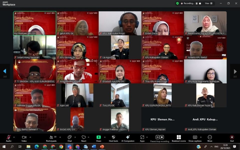 Yogyakarta, diy.kpu.go.id - Rabu (29/10/2025) KPU DIY melakukan Pemeriksaan Kas dan Pertanggungjawaban Keuangan Bulan Oktober Tahun 2025 secara daring. Tujuan dilaksanakan Pemeriksaan Kas ini adalah mewujudkan akuntabilitas pengelolaan dan penatausahaan kas bendahara pengeluara atas realisasi belanja yang dikeluarkan setiap bulan pada satuan kerja KPU Kabupaten/Kota se-DIY. Pemeriksaan kas ini dihadiri oleh Sekretaris, Kepala Sub Bagian Keuangan, Umum dan Logistik, Pejabat Pembuat Komitmen, Bendahara Pengeluaran dan Bendahara Pengeluaran Pembantu serta Pengelola Keuangan Sekretariat KPU se-DIY.