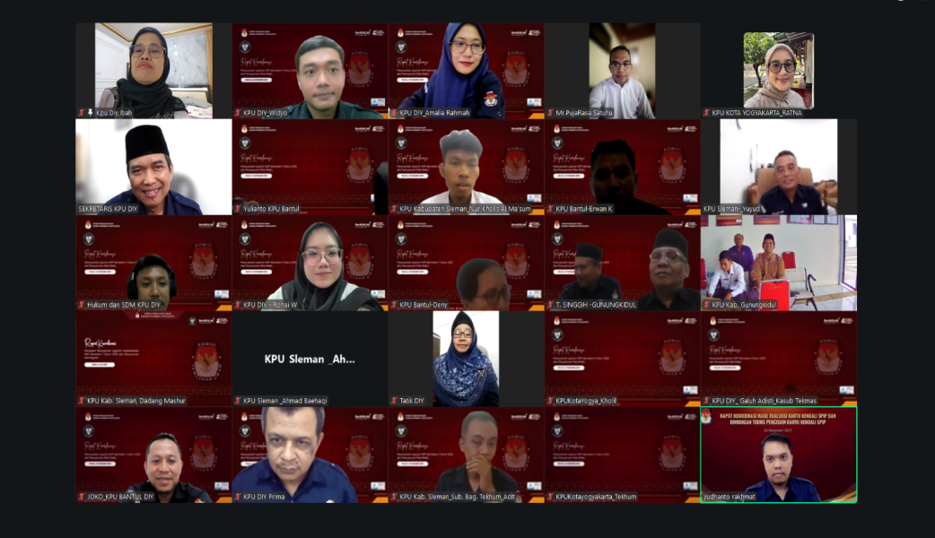 Yogyakarta, diy.kpu.go.id – Komisi Pemilihan Umum (KPU) Daerah Istimewa Yogyakarta menyelenggarakan Rapat Koordinasi Penyusunan Laporan SPIP Semester II Tahun 2025 dan Penyusunan Peta Risiko pada Selasa, 23 Desember 2025. Kegiatan ini diikuti oleh Ketua, Anggota, Sekretaris, Pejabat Struktural dan Fungsional, serta pelaksana pada Subbagian Hukum KPU DIY dan KPU Kabupaten/Kota se-DIY secara daring.