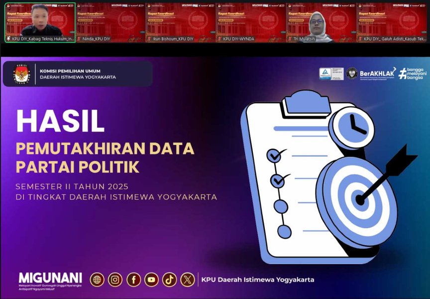 Yogyakarta, diy.kpu.go.id – Komisi Pemilihan Umum Daerah Istimewa Yogyakarta (KPU DIY) melaksanakan Rapat Koordinasi Hasil Pemutakhiran Data Partai Politik Semester II Tahun 2025 bersama Partai Politik (Parpol) tingkat Daerah Istimewa Yogyakarta secara daring melalui zoom meeting pada Rabu, 28 Januari 2026. Kegiatan ini dilaksanakan sebagai upaya menjaga akurasi, validitas, dan updating data Parpol yang dikelola oleh KPU, serta menyamakan persepsi dan mengidentifikasi permasalahan atau kendala yang dihadapi guna merumuskan langkah mitigasi yang tepat agar pelaporan Pemutakhiran Data Parpol Tahun 2026 berjalan dengan baik dan lancar. Hadir dalam kegiatan ini, Ketua, Anggota, Sekretaris KPU DIY beserta jajaran Sekretariat KPU DIY dan perwakilan Parpol tingkat DIY.