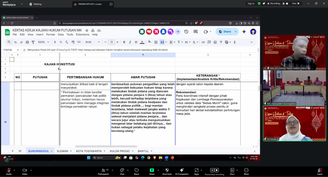 Yogyakarta, diy.kpu.go.id – Komisi Pemilihan Umum Daerah Istimewa Yogyakarta (KPU DIY) menyelenggarakan kegiatan Kajian Hukum dan Kajian Teknis Putusan Mahkamah Konstitusi terkait Judicial Review Undang-Undang Nomor 7 Tahun 2017 tentang Pemilihan Umum dalam dua sesi pada tanggal 25 dan 26 Februari 2026. Kegiatan yang dilaksanakan secara daring melalui Zoom Meeting ini dihadiri oleh KPU Kabupaten/Kota se-DIY.
