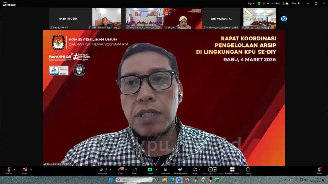 Yogyakarta, diy.kpu.go.id – Komisi Pemilihan Umum Daerah Istimewa Yogyakarta (KPU DIY) menggelar Rapat Koordinasi Pengelolaan Arsip di lingkungan KPU se-DIY secara daring melalui Zoom Meeting pada Rabu, 4 Maret 2026 pukul 13.00 WIB.