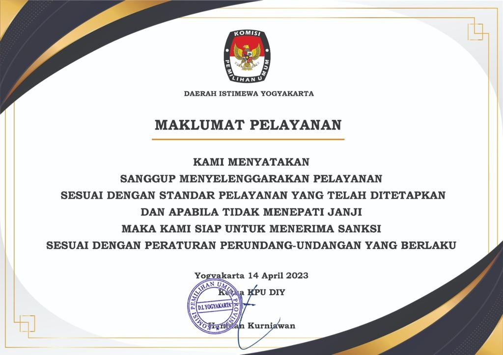 Maklumat Pelayanan 2023 Jumat, 14 April 2023 16:45 60 Maklumat pelayanan KPU DIY dapat diunduh di sini Bagikan: Telah dilihat 60 kali