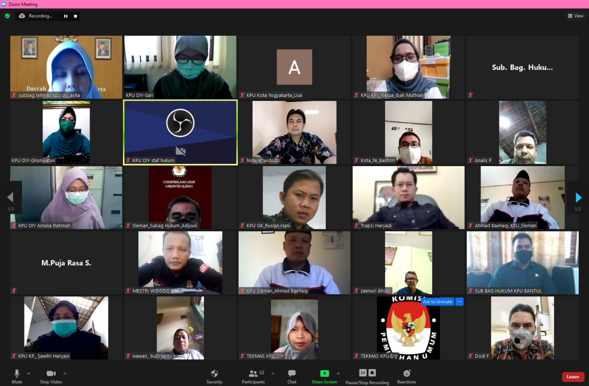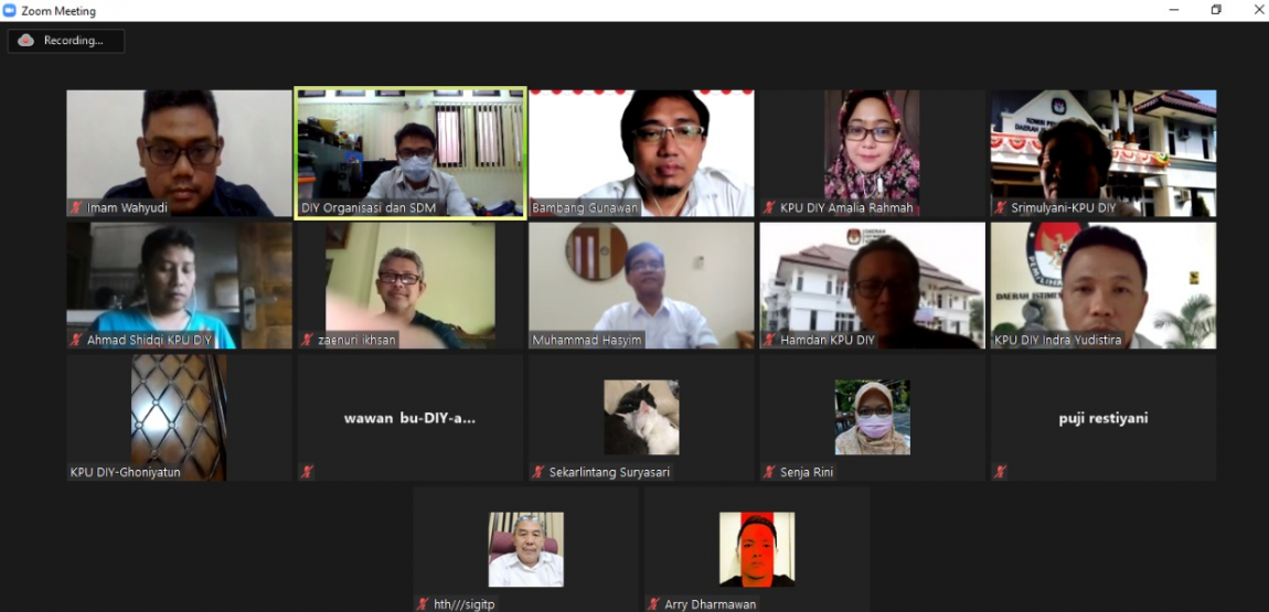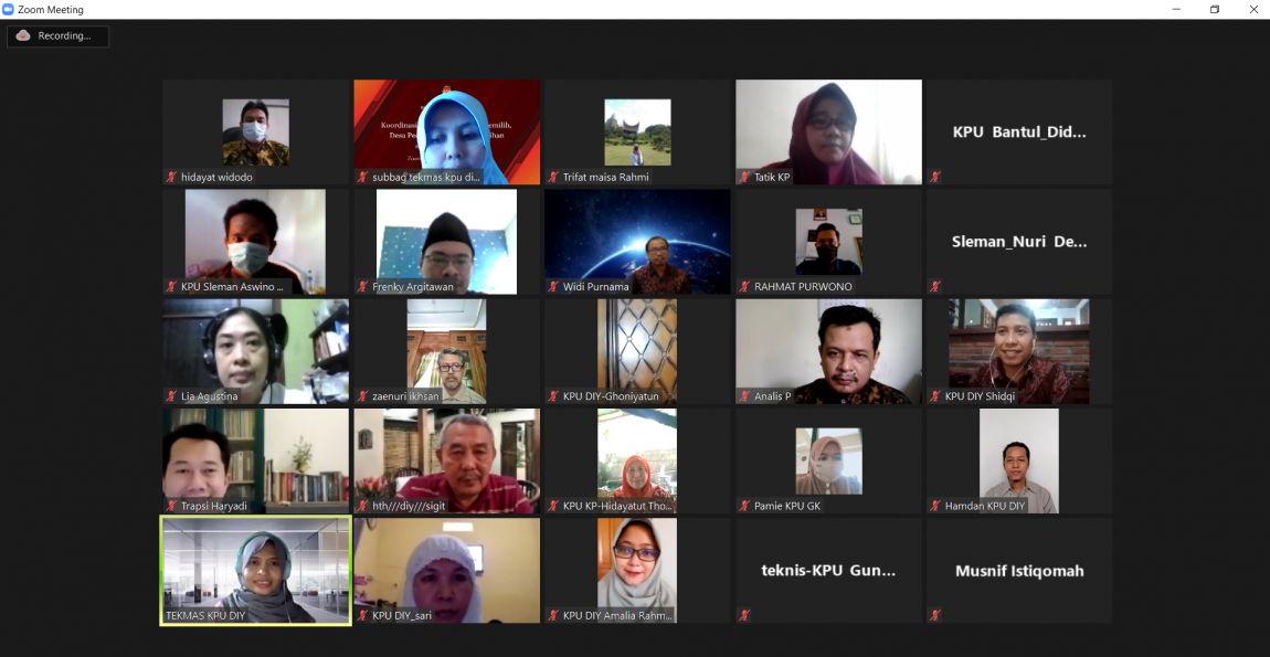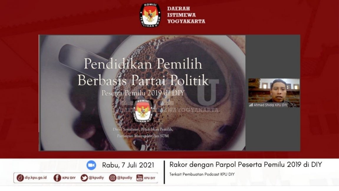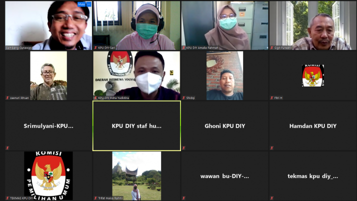 diy.kpu.go.id – Komisi Pemilihan Umum (KPU) Daerah Istimewa Yogyakarta (DIY) mengadakan Rapat Koordinasi Terkait Pendidikan Pemilih, Desa Peduli Pemilu dan Pemilihan serta Bakohumas pada Kamis (15/7). Rapat dihadiri oleh jajaran KPU DIY dan KPU se-DIY. Ahmad Shidqi, selaku Ketua Divisi Sosialisasi Pendidikan Pemilih Partisipasi Masyarakat dan SDM KPU DIY menyatakan bahwa Pendidikan Pemilih merupakan tanggung jawab bersama bukan hanya saat terjadinya pemilu saja, tetapi juga sebelum kegiatan pemilu terlaksana. Ahmad menjelaskan untuk kegiatan Bakohumas perlu dikoordinasikan tentang bagaimana dan apa saja kegiatan kehumasan di Kabupaten/Kota. Inti dari Bakohumas adalah bagaimana KPU Provinsi/Kabupaten/Kota membangun jejaring dengan instansi atau lembaga terkait dalam rangka kehumasan, membangun citra diri serta berbagi informasi. Selain itu, rapat ini membahas salah satu tujuan penyelenggaraan kegiatan KPU DIY, jagongan kehumasan, yaitu untuk membekali KPU Kabupaten/Kota dalam hal keterampilan atau skill kehumasan terutama mengenai kehumasan digital. Kehumasan digital sangatlah penting di era yang serba canggih ini karena di dalamnya dapat mengimplementasikan beberapa tema secara kreatif mengemas tentang kehumasan dengan berbagai cara. Selanjutnya, terkait pembekalan Desa Peduli Pemilu dan Pemilihan (DP3) akan dilakukan secara daring jika situasi Covid-19 ini tidak membaik dan semua yang terlibat harus tetap menunggu arahan dari KPU RI. Rapat ditutup oleh penyampaian Ahmad, “Kegiatan DP3 ini diharapkan bisa dilaksanakan secara luring sehingga di undur sampai bulan September 2021 dengan membatasi pesertanya. Namun semua ini melihat situasi juga kondisi ditengah pandemi Covid–19. Jika tetap tidak kondusif kegiatan ini akan dilaksanakan secara daring”.(hth)