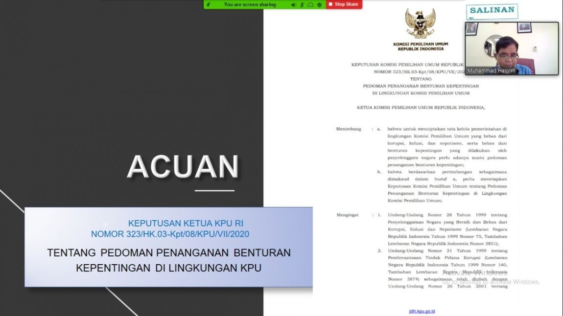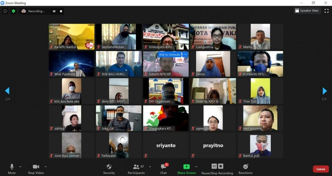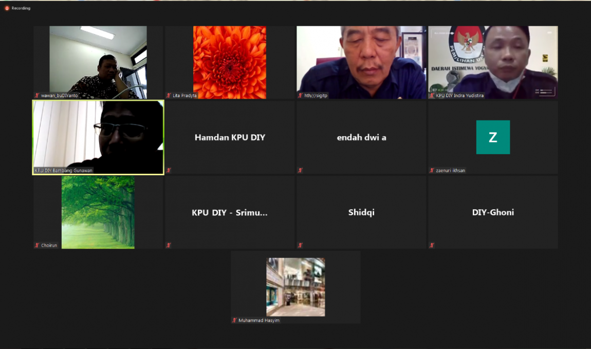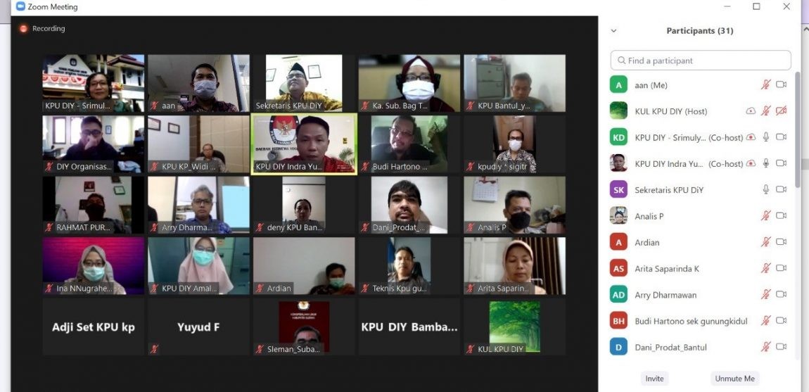 diy.kpu.go.id – Komisi Pemilihan Umum (KPU) Daerah Istimewa Yogyakarta melaksanakan rapat Pleno LPPA (Laporan Pertanggungjawaban Pengguna Anggaran) bulan Mei sebagai wujud pertanggungjawaban Sekretariat kepada Komisioiner secara daring pada tanggal 15 Juni 2021. Rapat LPPA dihadiri oleh Ketua KPU DIY, Anggota KPU DIY, Sekretaris KPU DIY, Kabag, Kasubbag Keuangan, dan Staf Keuangan dilingkungan KPU DIY. Rapat Pleno LPPA dibuka dan dipimpin oleh Hamdan Kurniawan selaku Ketua KPU DIY. Selanjutnya untuk penyampaian Laporan Pertanggungjawaban Penggunaan Anggaran APBN bulan Mei Tahun 2021 disampaikan oleh Muhammad Hasyim selaku Sekretaris KPU DIY. Selanjutnya untuk Rekapitulasi Laporan Pertanggungjawaban Penggunaan Anggaran APBN dan Hibah Kabupaten/Kota se-DIY disampaikan oleh Indra Yudistira, selaku Kasubbag Keuangan KPU DIY. Setelah penyampaian laporan LPPA bulan Mei tahun 2021 selesai disampaikan, Zaenuri Ikhsan selaku anggota KPU DIY menanggapi terkait dengan persiapan laporan untuk semester pertama agar menambahkan laporan update Barang Milik Negara (BMN) bisa sekaligus disampaikan dengan laporan keuangan. Selanjutnya Muhammad Hasyim selaku Sekretaris KPU DIY menginformasikan bahwa penghapusan BMN yang rusak berat masih menunggu persetujuan penghapusan dari Sekjend. Rapat LPPA ditutup pada pukul 13.24 WIB.