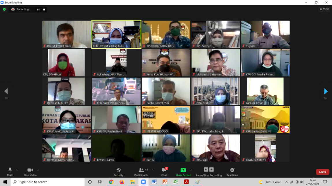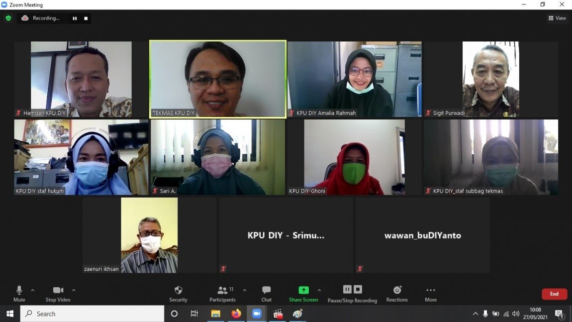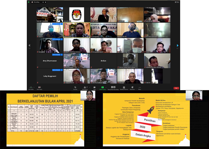 diy.kpu.go.id – Komisi Pemilihan Umum (KPU) Daerah Istimewa Yogyakarta (DIY) mengadakan Rapat Koordinasi (rakor) Sistem Pengendalian Intern Pemerintah (SPIP) dengan KPU Kabupaten/Kota se-Daerah Istimewa Yogyakarta secara daring, pada Kamis (27/5/2021). Rakor tersebut dibuka oleh Ketua KPU DIY, Hamdan Kurniawan yang dalam sambutannya mengatakan bahwa, “Ada kebutuhan dari KPU DIY untuk mengingatkan pada semua, sesuai regulasi, telah ada perubahan mengenai tanggung jawab pelaksanaan SPIP baik dari komisioner maupun sekretariat. Perubahan tersebut ada dalam Pasal 25 dan Pasal 35 ayat (5) huruf d Peraturan KPU Nomor 8 Tahun 2019.” Pada Rakor yang juga dihadiri oleh jajaran pimpinan KPU DIY, Ketua dan Ketua Divisi (kadiv) Hukum, Sekretaris, Kepala Sub Bagian, serta Operator SPIP KPU Kabupaten/Kota se-DIY, Siti Ghoniyatun selaku Kadiv Hukum KPU DIY menyampaikan bahwa pembentukan satuan tugas (satgas) sudah dilakukan dan SPIP lingkupnya luas tidak hanya terkait anggaran. Juga dihimbau kepada seluruh peserta Rakor dari KPU Kabupaten/Kota agar melakukan pendokumentasian yang baik dan secara teratur terhadap seluruh kegiatan SPIP. SPIP yang berjalan dengan baik akan mencegah terjadinya penyimpangan sehingga predikat Wajar Tanpa Pengecualian (WTP) akan tercapai dan terwujudnya penyelenggara Pemilu yang berintegritas. Selain itu, kartu kendali SPIP yang dikirim oleh KPU Kabupaten/Kota juga akan dinilai oleh KPU DIY dan akan diberi catatan untuk dilakukan perbaikan jika ada hal-hal yang belum memenuhi syarat.(SA)