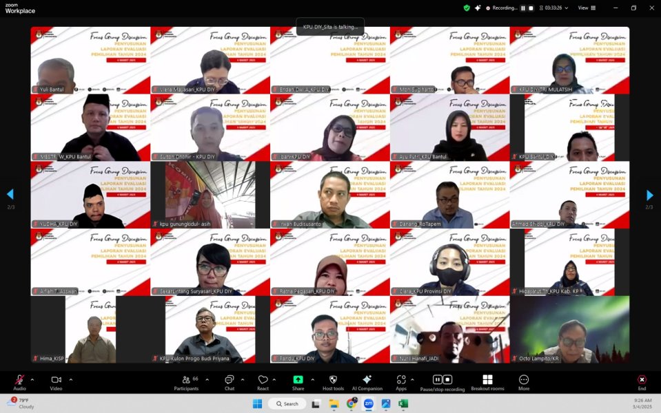 diy.kpu.go.id - Selasa, 4 Maret 2025 Komisi Pemilihan Umum (KPU) DIY mengadakan kegiatan Focus Group Discussion (FGD) Penyusunan Laporan Evaluasi Pilkada Tahun 2024 melalui layanan video conference berbasis cloud computing. Acara dihadiri oleh Komisioner, Pejabat Struktural, dan Pejabat Fungsional di lingkungan KPU DIY, Tim Pakar KPU RI, Bawaslu DIY, Stakeholder, Perwakilan Lembaga Pemantau Pemilihan, dan Media Massa di Daerah Istimewa Yogyakarta. Sebagai pembuka, Ketua KPU DIY, Ahmad Shidqi menyampaikan bahwa KPU Provinsi diminta untuk melaksanakan FGD, walaupun KPU DIY tidak melaksanakan pemilihan Kepala Daerah (Gubernur dan Wakil Gubernur) serta tidak memiliki anggaran hibah. Namun demikian KPU DIY sudah menjalankan fungsi-fungsi koordinasi dan supervisi ke KPU Kabupaten/Kota se-DIY. Tujuan dilaksanakannya FGD ini dalam rangka evaluasi penyelenggaraan pilkada di DIY dan hasilnya untuk perbaikan penyelenggaraan pilkada selanjutnya. ''Materi yang digunakan adalah hasil FGD yang dilaksanakan oleh 5 (lima) Kabupaten/Kota di DIY, serta menggunakan instrumen evaluasi pilkada dari KPU RI.''imbuh Ahmad Shidqi Kegiatan diisi dengan diskusi panel yang dipandu oleh Ketua Divisi Perencanaan Data dan Informasi KPU DIY, Moh Zaenuri Ikhsan, sebagai narasumber Koordinator Nasional JPPR, Nurlia Dian Paramita dan Mada Sukmajati, Ketua Program Studi Sarjana Politik dan Pemerintahan Fisipol UGM. Diskusi kelas yang dibagi 6 kelompok menjadi agenda berikutnya, masing-masing didampingi oleh Komisioner, Pejabat Struktural dan Fasilitator serta Notulis. Setiap kelas membahas permasalahan pilkada dari aspek tahapan dan non tahapan, aspek kelembagaan, dan aspek eksternalitas kemudian dilanjutkan dengan menyusun rekomendasi untuk perbaikan pilkada mendatang.