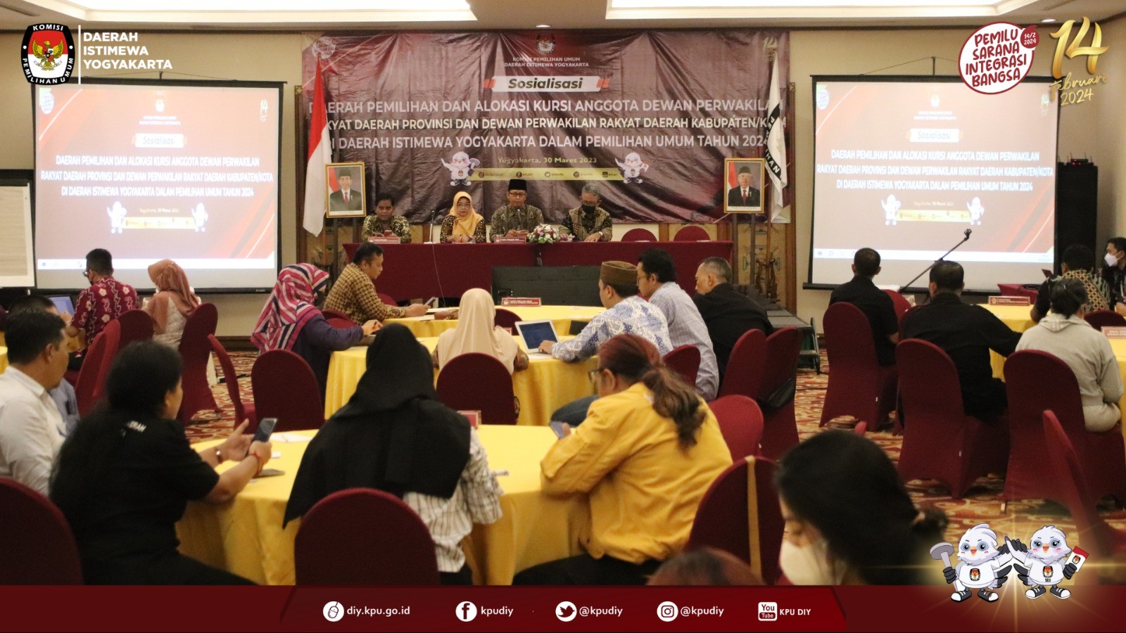 diy.kpu.go.id – KPU Republik Indonesia telah menetapkan Peraturan KPU Nomor 6 Tahun 2023 tentang Daerah Pemilihan dan Alokasi Kursi Dewan Perwakilan Rakyat, Dewan Perwakilan Rakyat Daerah Provinsi, dan Dewan Perwakilan Rakyat Daerah Kabupaten/Kota dalam Pemilu Tahun 2024. Sebagai bentuk sosialisasi terhadap Peraturan KPU tersebut, KPU DIY menyelenggarakan Sosialisasi Daerah Pemilihan dan Alokasi Kursi Anggota Dewan Perwakilan Rakyat Daerah Provinsi dan Dewan Perwakilan Rakyat Daerah Kabupaten/Kota di DIY dalam Pemilu Tahun 2024.