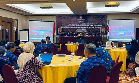 kpu.diy.go.id - Sebagai bagian dari pertanggungjawaban, prinsip akuntabilitas, serta sebagai evaluasi atas pelaksanaan program dan penggunaan anggaran Komisi Pemilihan Umum (KPU) se-Daerah Istimewa Yogyakarta, pada Selasa (17/01/2023), KPU DIY menyelenggarakan Rapat Pembahasan dan Penyusunan Laporan terkait Program dan Anggaran Tahun 2022, bertempat di Hotel Prime Plaza Yogyakarta. Kegiatan ini diikuti oleh KPU DIY, KPU Kabupaten/Kota se-DIY, serta instansi terkait di wilayah DIY.