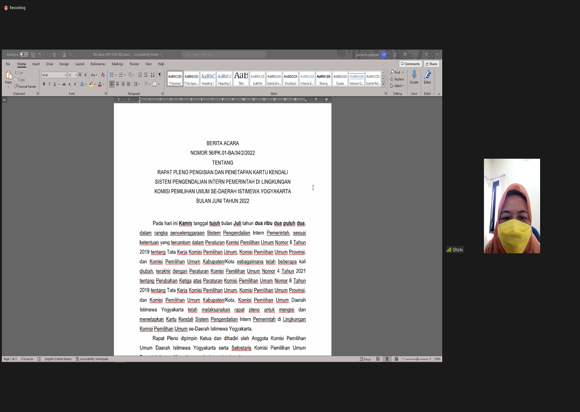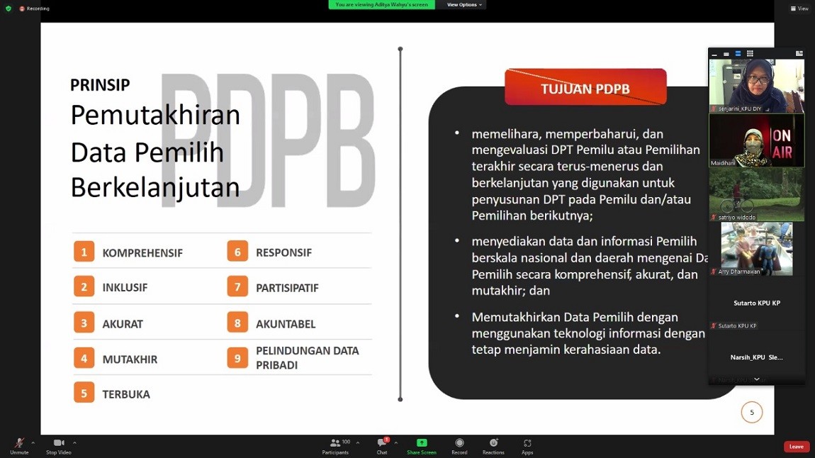 diy.kpu.go.id - Komisi Pemilihan Umum (KPU) Daerah Istimewa Yogyakarta (DIY) mengadakan Rapat Rapat Pleno Pengisian dan Penetapan Kartu Kendali Sistem Pengendalian Intern Pemerintah (SPIP) di Lingkungan KPU se-DIY secara daring, pada Kamis (7/7/2022). Rapat Pleno tersebut dibuka oleh Ketua Komisi Pemilihan Umum DIY, Hamdan Kurniawan. Rapat evaluasi dihadiri oleh Ketua dan Anggota KPU DIY beserta Sekretaris, Kepala Bagian, Kepala Sub Bagian bersama staf dibagian Teknis Penyelenggaraan Pemilu, Partisipasi dan Hubungan Masyarakat, Hukum dan Sumber Daya Manusia. Setelah rapat dibuka oleh Ketua KPU DIY, selanjutnya rapat dipandu oleh Ketua Divisi Hukum dan Pengawasan, Siti Ghoniyatun. Kemudian dilakukan pemaparan Kartu Kendali SPIP di lingkungan KPU se-DIY. Diakhir rapat pleno dibacakan Berita Acara oleh Kepala Sub Bagian Hukum dan SDM KPU DIY, Amalia Rahmah dan Kartu Kendali SPIP bulan Juni ditetapkan. Selanjutnya laporan kartu Kartu Kendali SPIP dikimkan ke KPU Republik Indonesia tanggal 8 Juli 2022. (SL)
