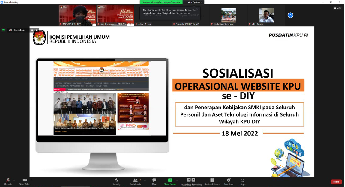 diy.kpu.go.id - Pengoptimalisasian pengunaan website dewasa ini sangat dibutuhkan oleh lembaga negara seperti KPU, hal tersebut tidak terlepas dari kebutuhan masyarakat untuk mendapatkan informasi mengenai Pemilihan Umum secara cepat dan akurat. Komisi Pemilihan Umum Daerah Istimewa Yogyakarta (KPU DIY), lembaga negara yang bertugas sebagai penyelenggara Pemilihan Umum menyelengarakan kegiatan “Pengelolaan Laman Resmi KPU DIY dan KPU Kabupaten/Kota Se-DIY” yang dilaksanakan secara daring melalui platform Zoom (18/5/2022), yang diikuti oleh perwakilan masing-masing KPU Kabupaten/Kota yang ada di Daerah Istimewa Yogyakarta. Pada kesempatan tersebut ketua KPU DIY, Hamdan Kurniawan, menyampaikan beberapa hal mengenai mengapa diadakan pelatihan pengelolaan laman web resmi KPU di DIY. Beliau menjelaskan bahwa pelatihan tersebut berguna untuk uniformitas (keseragaman) template yang disediakan oleh KPU RI. Tidak hanya itu, proses migrasi laman resmi KPU juga berguna untuk keamanan sistem. Beliau juga berpendapat pengoptimalisasian laman web KPU juga akan berdampak kepada masyarakat dalam mendapatkan informasi seputar pemilihan, mengingat website KPU merupakan salah satu jendela utama bagi masyarakat untuk mendapatkan informasi penting seputar pemilihan. Sesi materi dibuka oleh bapak Andre Putra, Plt. Kepala Pusat Data dan Informasi KPU. Beliau memberikan penjelasan bahwa standar manajemen keamanan informasi website akan lebih baik, dimana standar kemanan sudah disajikan dalam bentuk surat edaran. Dengan adanya template ini, KPU RI membuat standar keamana yang diberi nama ITSA (IT Security Assessment) sehingga website yang saat ini digunakan mempunyai kerentanan kemanan yang sudah terukur, dalam artian apabila terjadi gangguan keamanan dapat dilakukan tindakan penanganan cukup hanya menggunakan sekali patching kemudian seluruh satker (satuan kerja) yang menggunakan sistem template baru tersebut akan terupdate dari sisi engine website, sehingga jika terjadi serangan oleh hacker (peretas) akan jauh lebih cepat dalam proses penaganannya. Beliau juga menambahkan bahwa website dengan template yang diberikan oleh KPU RI telah lulus uji dari tim BSSN (Badan Siber dan Sandi Negara). Secara teknis pelatihan ini, dipandu oleh Febriansyah selaku staf admin teknisi KPU. Secara garis besar beliau menjelaskan bahwa template web KPU merupakan sebuah template yang bukan seperti Wordpress atapun CMS karena website KPU ini menggunakan Framework Laravel dan website ini memiliki keseragaman dengan KPU RI dan KPU satker lainnya. Adapun alasan menggunakan template KPU adalah untuk keseragaman tampilan website seluruh KPU di Indonesia mengingat sebelumnya tidak ada keseragaman tampilan wesite karena menggunakan jenis platform blogging yang berbeda disetiap KPU di Indonesia, dan template yang sudah di sediakan KPU RI ini lebih mudah dalam perbaikan keamanan (bug) dan lebih mudah dalam mengelola mitigasi apabila terjadi serangan dari peretas (hacker). Setelah selesai memberikan materi tiap KPU Kota/Kabupaten se-DIY diberikan kesempatan untuk bertanya dimulai dari KPU Kabupaten Sleman, lalu berlanjut ke KPU Kulonprogo, KPU Gunung Kidul, KPU Kota Yogyakarta, dan yang terakhir KPU Bantul. Pertanyaan dari masing-masing perwakilan KPU daerah pun beragam, dan tidak jarang KPU setiap daerah memberikan beberapa masukan untuk meningkatkan kualitas dari website yang akan dibangun dengan menggunakan template yang telah disediakan oleh KPU RI. Setelah pertanyaan dari masing-masing perwakilan terjawab, dan masukan atau saran yang disampaikan oleh masing-masing perwakilan KPU daerah ditampung, pelatihan tersebut pun selesai dan ditutup dengan pengambilan foto dokumentasi dan doa bersama.(JF)