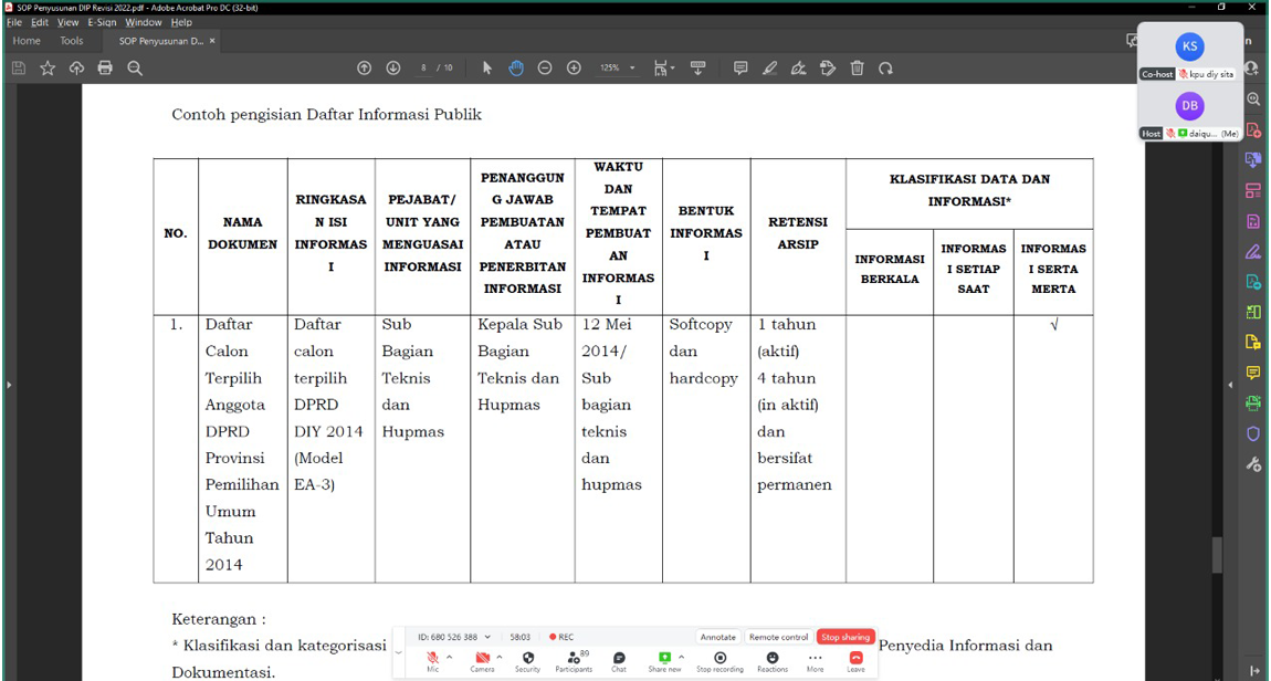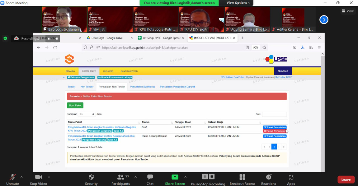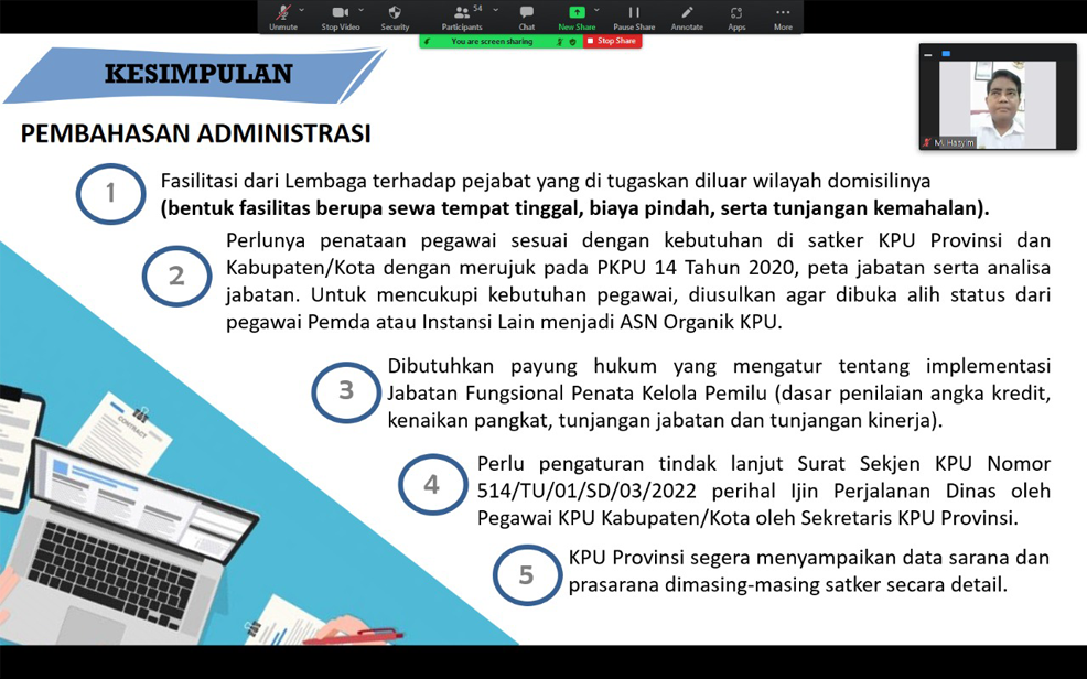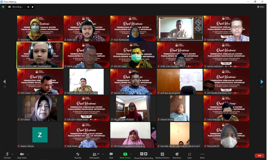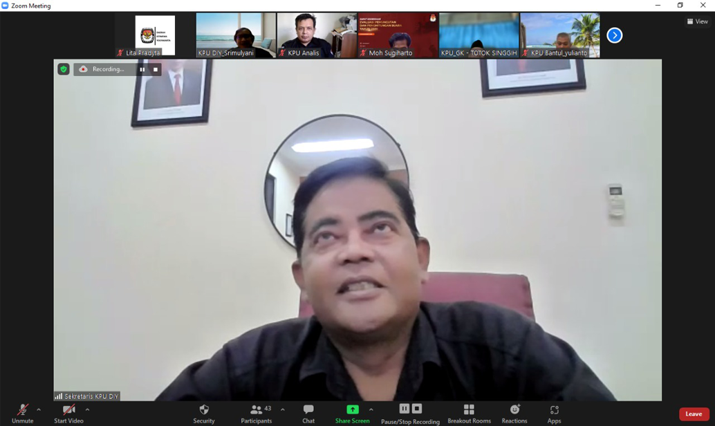diy.kpu.go.id – KPU DIY laksanakan rapat Koordinasi Kesatkeran yang dilakukan rutin setiap bulan sebagai sarana koordinasi bagi satuan kerja KPU se-DIY. Rapat kesatkeran bulan Maret 2022 dilaksanakan pada 23 Maret 2022 secara daring. Rapat Kesatkeran ini dihadiri oleh Pejabat Struktural dan Pejabat Pembuat Komitmen KPU se-DIY. Rapat dibuka dan dipandu oleh Kepala Bagian Keuangan, Umum, dan Logistik, Srimulyani. Disampaikan oleh Srimulyani susunan acara Rapat Koordinasi Kesatkeran sebagai berikut: penyampaian materi dari masing-masing Bagian KPU DIY dilanjutkan tanggapan serta penyampaian terkait tugas, fungsi dan kegiatan dari masing-masing KPU Kabupaten Kota se DIY, selanjutnya pengarahan yang disampaikan oleh Sekretaris KPU DIY. Paparan pertama disampaikan oleh Kepala Bagian Teknis Penyelenggara, Partisipasi, dan Hubungan Masyarakat, Hukum dan SDM (Kabag. HTH dan SDM), Moh Sugiharto. Kabag HTH dan SDM KPU DIY menyampaikan terkait penyusunan dan pelaporan SKP Tahun 2021, laporan LHKPN, LHKASN, penyampaian SPT Tahunan, SPIP, dan JDIH. Pemaparan selanjutnya disampaikan oleh Kepala Bagian Keuangan, Umum, dan Logistik (Kabag KUL), Sri Mulyani terkait dengan Realisasi Anggaran sampai dengan Februari 2022 KPU se-DIY, Rekap Perbandingan Simonika dengan Omspan KPU se DIY per 23 Maret 2022, Rekap Progress SIRUP KPU DIY dan KPU Kabupaten/Kota se DIY, Rencana Kegiatan Bimtek dan Sosialisasi Bela Pengadaan, Tata Cara Pencatatan Non Tender dan Pencatatan Swakelola dalam SPSE dengan narasumber dari Biro Logistik KPU RI, kegiatan rutin lain Supervisi dan Monitoring Penatausahaan Kas, dan kegiatan terkait dengan pengamanan dengan narasumber dari Biro Umum KPU RI. Pemaparan selanjutnya yaitu kegiatan dan tusi dari Kepala Bagian Perencanaan Data dan Informasi (Kabag Rendatin), Bambang Gunawan, menyampaikan terkait dengan kegiatan yang akan dilakukan yaitu: Sosialisasi Juknis Anggaran dengan mengundang KPU RI, Rakor penyusunan RAB Pemilihan Tahun 2024, Rakor Evaluasi Capaian Kinerja KPU Kabupaten/Kota Triwulan I, Evaluasi pelaksanaan rencana aksi Reformasi Birokrasi KPU Kabupaten/Kota, dan Evaluasi pelaksanaan program dan anggaran KPU Kabupaten/Kota triwulan I. Selanjutnya penyampaian terkait dengan Rekapitulasi Daftar Pemilih Berkelanjutan Bulan Maret 2022. Setelah penyampaian dari masing-masing bagian dari KPU DIY, Sri Mulyani selaku pimpinan Rapat mempersilakan Sekretaris Kabupaten/Kota se-DIY untuk menanggapi dan penyampaian laporan terkait tusi dan kegiatan di Satker masing-masing. Selanjutnya Muhammad Hasyim selaku Sekretaris KPU DIY memberikan arahan sekaligus memberikan kebijakan-kebijakan yang harus dilakukan dalam menjalankan ketugasan sebagai Satker. Rapat Kesatkeran diakhiri pukul 16.40 WIB.(kul)