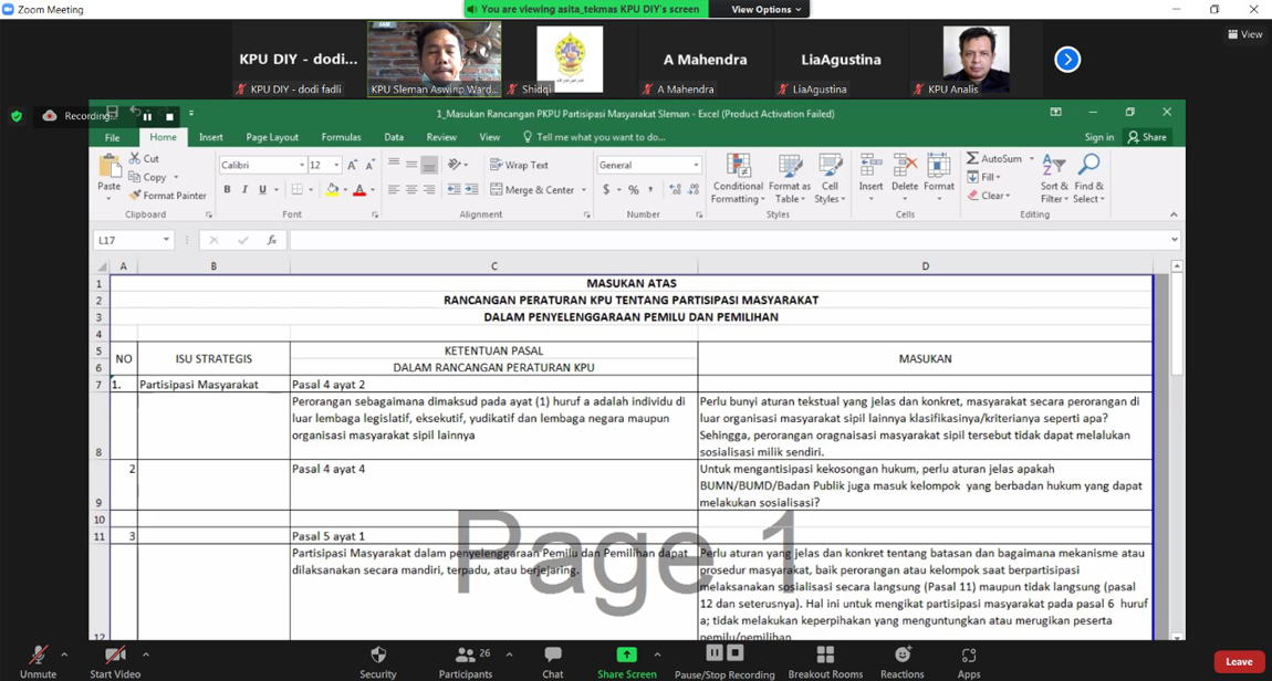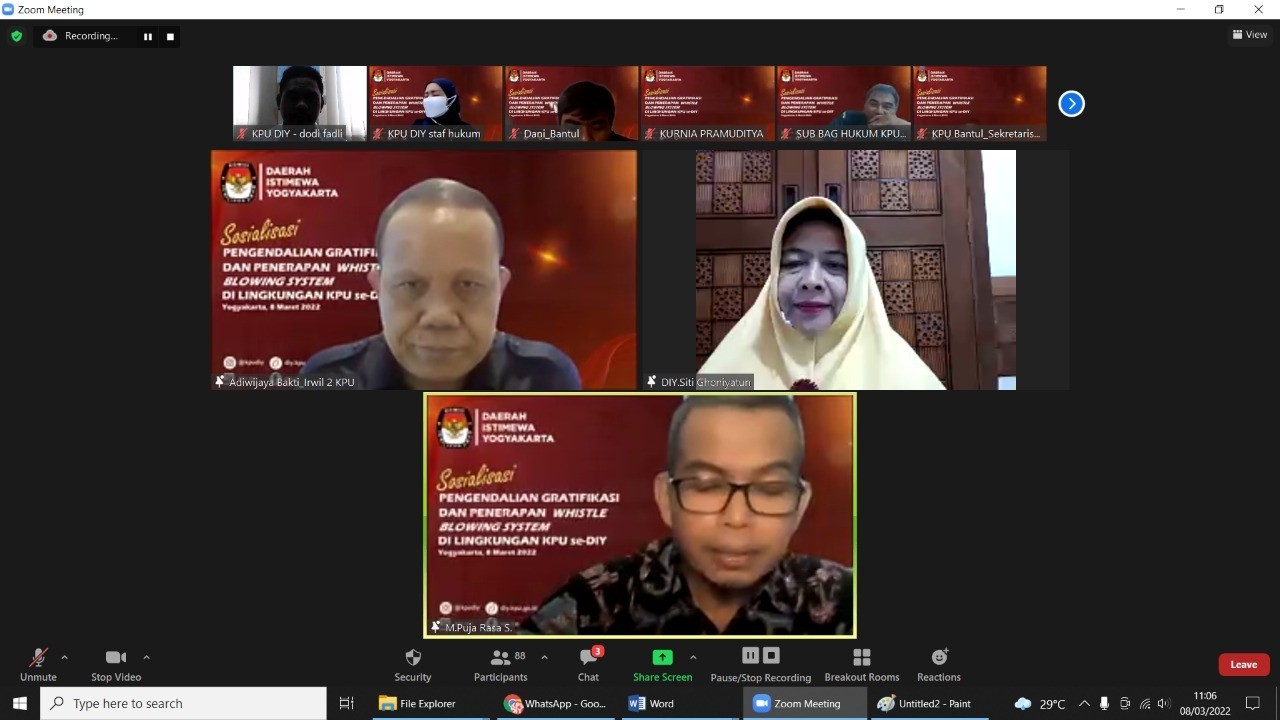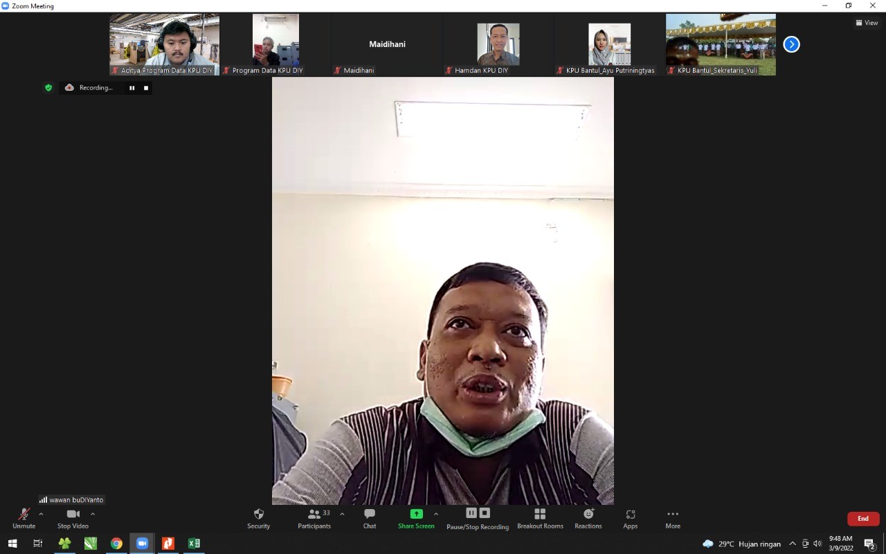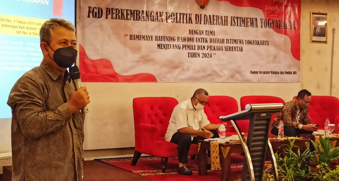 diy.kpu.go.id - Ketua Divisi Teknis Penyelenggaraan Pemilu Komisi Pemilihan Umum Daerah Istimewa Yogyakarta (KPU DIY), Moh Zaenuri Ikhsan, menghadiri kegiatan FGD Perkembangan Politik “Hamemayu Hayuning Bawono untuk Daerah Istimewa Yogyakarta Menjelang Pemilu dan Pilkada Serentak Tahun 2024“. Acara tersebut diselenggarakan oleh Badan Kesatuan Bangsa dan Politik DIY pada Rabu (16/3). Kegiatan ini diikuti oleh Kepolisian Daerah DIY, instansi terkait di lingkungan Pemerintah Daerah (Pemda) DIY, Organisasi Masyarakat tingkat DIY, Kesbangpol Kabupaten/Kota se-DIY, Bawaslu DIY, serta Partai Politik tingkat DIY. Moh Zaenuri Ikhsan bertindak sebagai narasumber dan memaparkan materi dengan judul Persiapan Penyelenggaraan Pemilu dan Pemilihan Serentak Tahun 2024. Dalam paparannya Ikhsan menyampaikan bahwa KPU DIY tengah mempersiapkan penyelenggaraan Pemilu dan Pemilihan Serentak tahun 2024. Persiapan tersebut meliputi penyusunan kebutuhan kegiatan dan anggaran tahapan Pemilu mulai persiapan hingga penyelesaian, penguatan kelembagaan dan Sumber Daya Manusia (SDM), serta pemutakhiran Data Pemilih Berkelanjutan di DIY. Dalam penutupnya Ikhsan menyampaikan, “Perlu dilakukan sinergi, kerjasama serta koordinasi yang rutin guna memperlancar dan mensukseskan Pemilu dan Pemilihan Serentak Tahun 2024”.(AERW)
