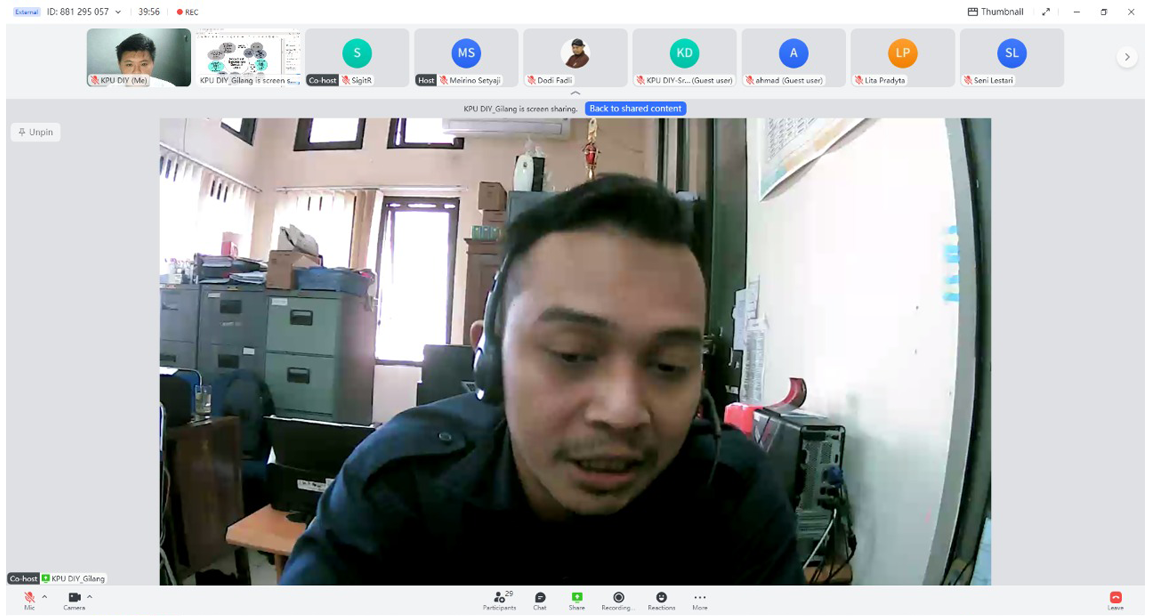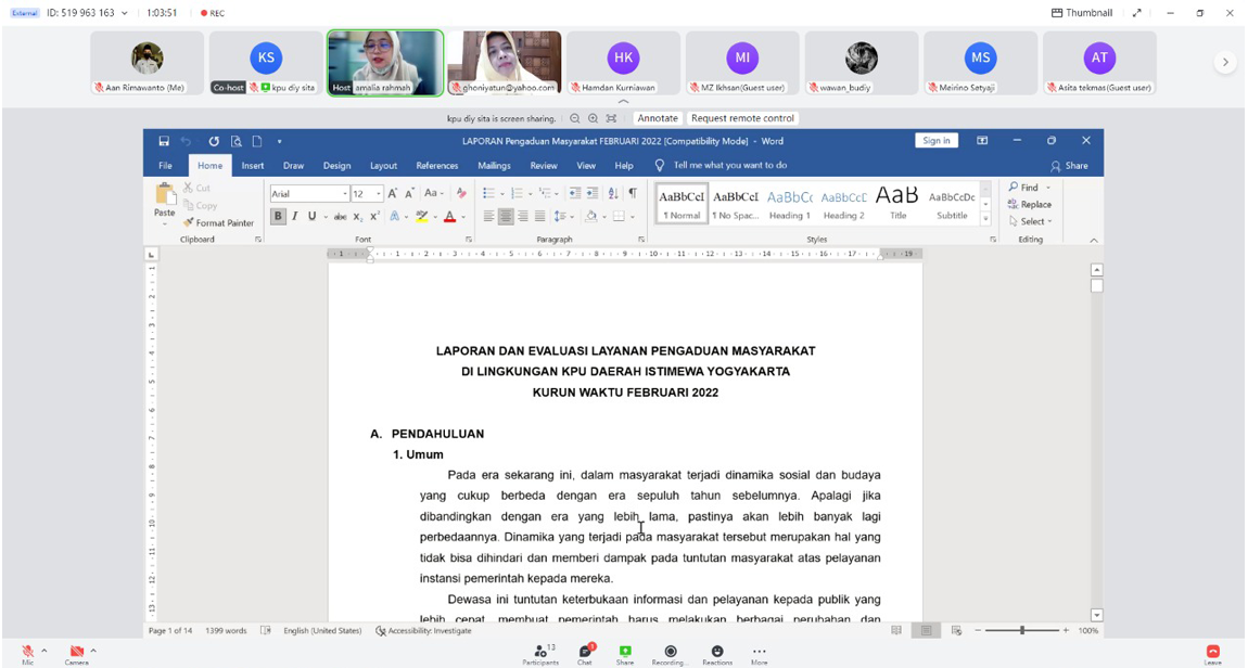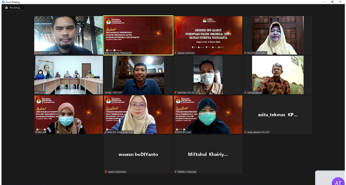 diy.kpu.go.id - Selasa (08/3) Komisi Pemilihan Umum DIY (KPU DIY) menerima audiensi DPD Kaukus Perempuan Politik Indonesia (KKPI) Daerah Istemewa Yogyakarta. Pertemuan ini selain melakukan audiensi juga menjalin silahturahmi antara KPPI dengan KPU DIY. Audiensi dihadiri oleh KPPI DIY yang terdiri dari Ketua beserta pengurus inti dan diterima oleh KPU DIY terdiri dari Ketua, Anggota, Sekretaris KPU DIY dan jajaran di lingkungan KPU DIY. Penerimaan audiensi oleh KPU DIY dilakukan secara daring untuk mencegah penyebaran virus Covid-19. Latar belakang dari acara ini tidak hanya sekedar silaturahmi antara KPU DIY dengan DPD KKPI DIY namun juga membuka forum diskusi kepada DPD KKPI DIY. Dalam sambutan dari Ketua KPU DIY, Hamdan Kurniawan mengucapkan terima kasih kepada ketua dan pengurus inti KKPI DIY yang bersedia menghadiri acara ini. Pada silaturahmi dan diskusi tersebut Ketua DPD KKPI Yuni Satia Rahayu menyampaikan, contoh permasalahan saat penyelenggaraan Pemilu atau Pileg dan juga keterwakilan dari calon legislatif perempuan yang tidak mencapai target yaitu sebanyak 30%. Selain itu, DPD KKPI DIY juga menyampaikan kekhawatirannya jika terjadi pelanggaran berupa poltik uang dalam Pemilu mendatang. DPD KKPI DIY juga menyampaikan harapannya agar KPU DIY bisa memberikan perhatian pada pemilih dan caleg perempuan. Termasuk juga mengawal agar tidak terjadi kecurangan kepada calon legislatif perempuan. Menanggapi diskusi, Ketua Divisi Teknis KPU DIY, Zaenuri Ikhsan mengatakan kalau sebagai penyelenggara pemilu, KPU DIY selalu memberikan perlakuan yang adil kepada semua pihak. Baik itu pemilih ataupun calon. Karena itu, Ikhsan justru mendorong DPD KKPI DIY untuk bersama KPU mewujudkan Pemilu yang bersih, jujur dan adil. Juga agar bersedia melaporkan jika menemui indikasi kecurangan. Pada akhir diskusi, KPU DIY menyampaikan cara melakukan permohonan informasi melalui PPID kepada KPPI DIY.(MRGA)
