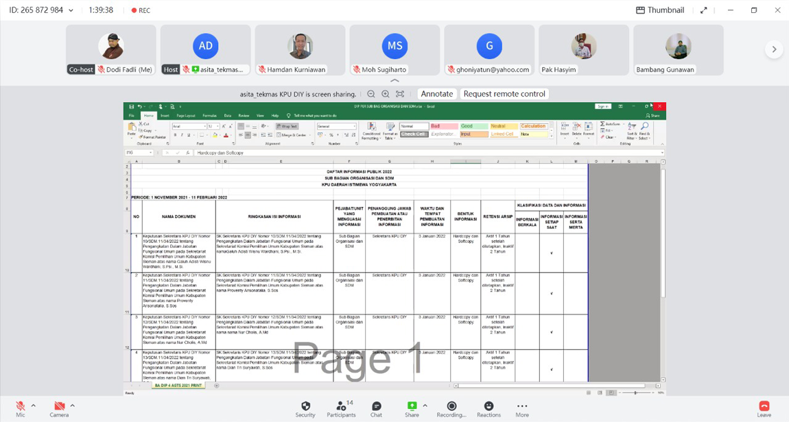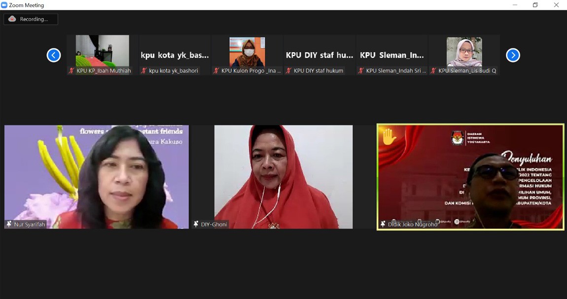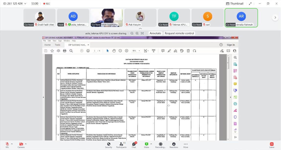 diy.kpu.go.id – Rabu (16/02) Komisi Pemilihan Umum Daerah Istimewa Yogyakarta (KPU DIY) mengadakan Rapat Pleno Pembaruan Daftar Informasi Publik KPU DIY Bulan Februari 2022. Kegiatan tersebut diadakan secara daring, dihadiri oleh Ketua, Anggota, Sekretaris KPU DIY, seluruh Kepala Bagian dan Kepala Sub Bagian, serta Plt dan jajaran Staf di lingkungan Bagian Teknis Penyelenggaraan Pemilu, Partisipasi dan Hubungan Masyarakat, Hukum dan Sumber Daya Manusia KPU DIY. Rapat dibuka dan dipimpin oleh Ketua KPU DIY, Hamdan Kurniawan. Rapat DIP tersebut dilakukan setiap 3 bulan sekali yang memungkinkan adanya pembaruan DIP dan menjadi perwujudan transparansi kelembagaan KPU DIY terhadap informasi publik. Hamdan menyampaikan “Pada rapat yang dilaksanakan beberapa waktu lalu, sekretariat telah mengumpulkan dokumen informasi publik dan telah mengkompilasi pembaruan DIP. Dengan demikian, pada rapat yang berlangsung pada hari ini peserta rapat memberikan masukan terhadap pembaruan tersebut.” Selanjutnya, pembaharuan DIP periode 1 November 2021-10 Februari 2022 dibacakan oleh Sub Bagian Program dan Data, Sub Bagian Organisasi dan Sumber Daya Manusia, Sub Bagian Keuangan, Sub Bagian Hukum, Sub Bagian Teknis dan Hupmas, Sub Bagian Umum dan Logistik serta pengadaan. Seluruh sub bagian dan pengadaan mendapatkan beberapa pembaharuan serta masukan yang diterima oleh peserta rapat pleno.(IKAM)