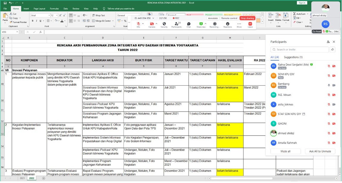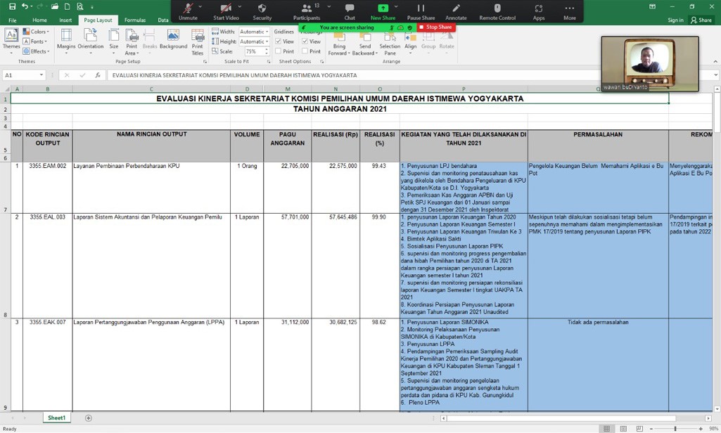 diy.kpu.go.id - Komisi Pemilihan Umum Daerah Istimewa Yogyakarta (KPU DIY) pada hari Kamis (13/01/2022) melaksanakan rapat pembahasan penyusunan Laporan Kinerja KPU DIY Tahun 2021. Sebagai lembaga yang menggunakan anggaran negara dalam pelaksanaan tugas dan kegiatannya serta lembaga yang mengedepankan sistem keterbukaan, transparansi, akuntabilitas dan dapat dipertanggungjawabkan kegiatannya, KPU DIY memenuhi kewajibannya untuk membuat Laporan Kinerja. Laporan Kinerja KPU DIY juga merupakan wujud pertanggungjawaban KPU DIY atas pelaksanaan tugas dan fungsinya, serta sebagai bahan analisis dalam membuat kebijakan untuk meningkatkan kinerja di masa yang akan datang. Pembuatan Laporan Kinerja mengacu pada Peraturan Presiden Nomor 29 Tahun 2014 tentang Sistem Akuntabilitas Kinerja Instansi Pemerintah dan Peraturan Menteri Pendayagunaan Aparatur Negara dan Reformasi Birokrasi Nomor 53 Tahun 2014 tentang Petunjuk Teknis Perjanjian Kinerja, dan Tata Cara Reviu atas Laporan Kinerja Instansi Pemerintah. Laporan Kinerja ini memberikan penjelasan mengenai pencapaian kinerja KPU DIY selama Tahun Anggaran 2021, dimana setiap capaian kinerja (perfomance result) Tahun 2021 tersebut dibandingkan dengan Perjanjian Kinerja Tahun 2021 sebagai tolok ukur dan gambaran tingkat keberhasilan KPU DIY selama satu tahun. Di dalam Laporan Kinerja ini juga akan dijabarkan kegiatan-kegiatan yang merupakan inovasi dan kreasi meski belum didukung anggaran.(pdatin)