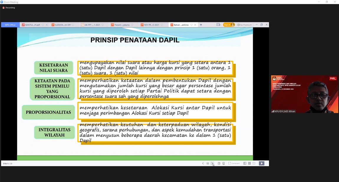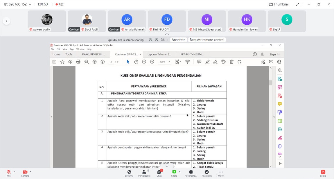 diy.kpu.go.id - Komisi Pemilihan Umum (KPU) Daerah Istimewa Yogyakarta (DIY) mengadakan diskusi tentang Kuesioner Pemetaan Penerapan Sistem Pengendalian Intern Unsur Lingkungan Pengendalian di Lingkungan KPU DIY secara daring, pada Senin (3/1/2022). Hadir dalam kegiatan ini, Anggota KPU DIY beserta Sekretaris, Kepala Bagian dan Kepala Sub Bagian di lingkungan KPU DIY bersama staf dibagian Hukum, Teknis dan Hupmas. Ketua KPU DIY, Hamdan Kurniawan dalam sambutan pembukaan menyampaikan, “Kerangka evaluasi melalui Kuesioner ini perlu kemudian dijawab secara jujur karena ada beberapa pertanyaan yang itu akan menunjukkan seberapa jauh kita sudah mengadakan pengendalian. Data yang sudah dikompilasi dapat menjadi pijakan untuk dapat melakukan perbaikan-perbaikan, demikian juga di KPU Kabupaten/Kota.” Ketua Divisi Hukum dan Pengawasan KPU DIY, Siti Ghoniyatun pada kesempatan yang sama menyampaikan bahwa ada 72 poin pertanyaan kuesioner yang nanti mungkin jawaban-jawabannya akan disesuaikan dengan lingkungan pengendalian pada masing-masing bagian. Selanjutnya, disampaikan bahwa perlu adanya penjelaskan kuesioner tersebut sampai dengan tingkat KPU Kabupaten/kota agar tidak menimbulkan perbedaan penafsiran terhadap pertanyaan yang ada dalam kuesioner. Juga perlu, KPU Kabupaten/Kota diingatkan untuk mengirimkan hasil kuesioner yang didapat dari KPU DIY dan KPU Kabupaten/Kota kepada KPU Republik Indonesia paling lambat 20 Januari 2022.(SA)