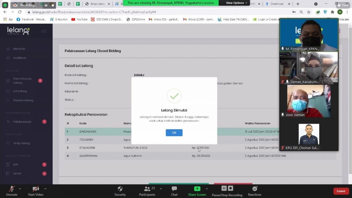 Pelaksanaan lelang online didampingi langsung perwakilan dari Kantor Pelayanan Kekayaan Negara dan lelang (KPKNL) Yogyakarta yaitu M. Firmansyah dan Intan Dias. Diawali dari KPU Kabupaten Bantul yang bertindak sebagai saksi adalah Ardian Dewanto Setiadi dan Santoso Bayu Putranto dengan nominal pemenang lelang sebesar Rp 29.708.600. Selanjutnya dari KPU Kabupaten Gunungkidul sebagai saksi yaitu Harry Prasetyo dan Didik Heru Purnomo dengan nominal pemenang lelang sebesar Rp 39.987.100. Terakhir dari KPU Kabupaten Sleman, Nuri Dewi Mawarni dan Parjiono sebagai saksi dengan nominal pemenang lelang sebesar Rp 33.010.000. Pelaksanaan lelang online berjalan lancar tanpa kendala, dan dapat dipertanggungjawabkan.(kul)