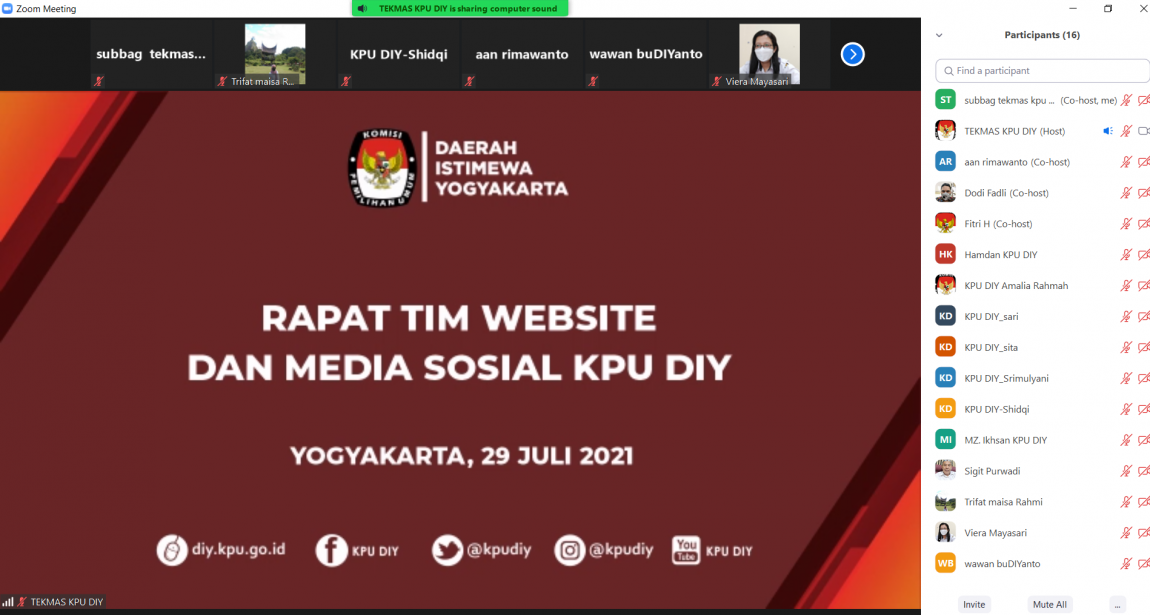 diy.kpu.go.id – Kamis, (29/07) Komisi Pemilihan Umum Daerah Istimewa Yogyakarta (KPU DIY) mengadakan Rapat Tim Website dan Media Sosial. Kegiatan ini diadakan secara daring melalui platform zoom meeting dan dihadiri oleh Komisioner, Sekretaris beserta jajaran di lingkungan KPU DIY. Pada kesempatan tersebut, Sigit Purwadi, Kepala Bagian Hukum, Teknis, dan Hupmas KPU DIY, membuka pelaksanaan rapat serta melakukan review terhadap pelaksanaan pengelolaan website dan media sosial KPU DIY. Sigit mengatakan, “Kita harus menyempurnakan fitur website sekaligus bersamaan dengan perbaikan dalam rangka tindak lanjut monitoring dan evaluasi (monev) dari Komisi Informasi DIY, review tampilan website diperbaiki agar lebih baik lagi.” Sigit menjelaskan bahwa setiap bagian diwajibkan untuk terus menaikkan performa kinerja, baik yang diinformasikan melalui website maupun media sosial. Hal tersebut dilakukan agar informasi yang disampaikan dapat memberikan pengaruh baik bagi publik. Ahmad Shidqi, Ketua Divisi Sosialisasi, Pendidikan Pemilih dan Partisipasi Masyarakat KPU DIY, menegaskan bahwa untuk personil yang mendapat tugas sebagai reporter berita dibutuhkan kesanggupan ekstra dalam merumuskan berita-berita terkait pada bagiannya. Penulis juga harus dapat memberikan konsep yang lebih menarik untuk membuat publik tertarik membaca, lanjut Ahmad.(hth)