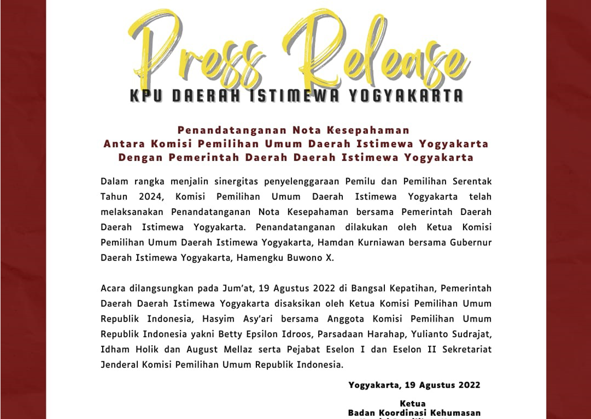 Press Release Penandatanganan Nota Kesepahaman Antara KPU DIY dengan Pemerintah Daerah DIY Jumat, 19 Agustus 2022 16:23 185 Press Release Penandatanganan Nota Kesepahaman Antara KPU DIY dengan Pemerintah Daerah DIY dapat diunduh di sini. Baca Selengkapnya
