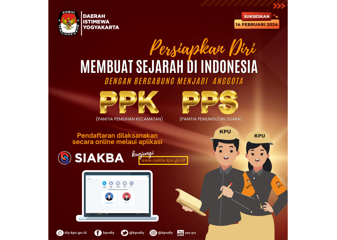 Persiapan Pendaftaran Anggota PPK PPS Pemilu 2024 Kamis, 03 November 2022 12:00 937 Informasi Persiapan Pendaftaran Anggota PPK PPS Pemilu 2024 dapat diunduh di sini. Baca Selengkapnya