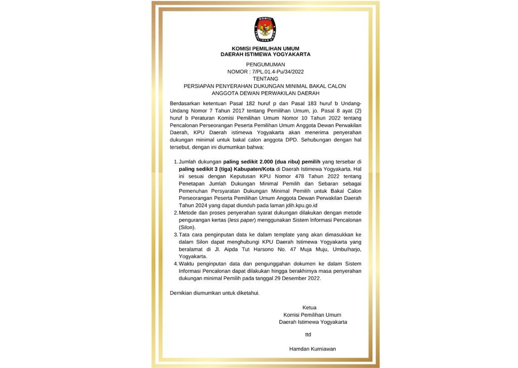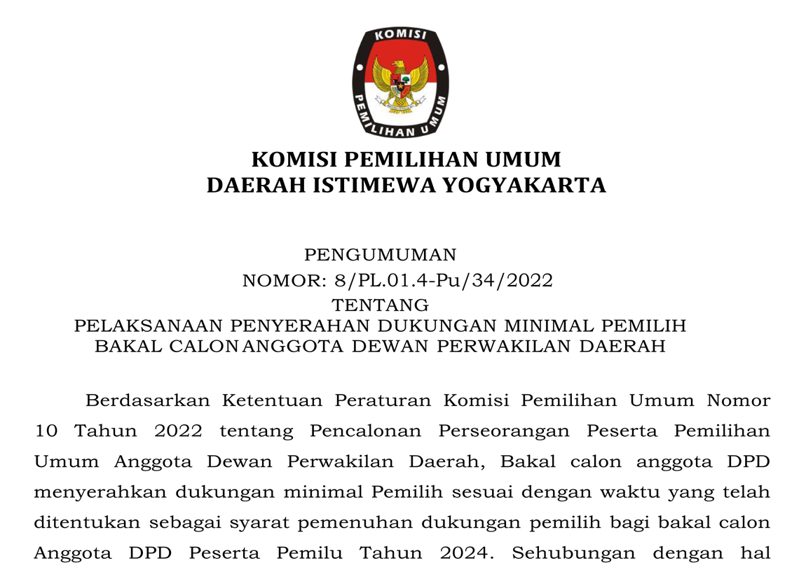 Pengumuman Pelaksanaan Penyerahan Dukungan Minimal Pemilih Bakal Calon Anggota Dewan Perwakilan Daerah Kamis, 15 Desember 2022 17:12 171 Pengumuman Pelaksanaan Penyerahan Dukungan Minimal Pemilih Bakal Calon Anggota Dewan Perwakilan Daerah dapat diunduh di sini. Baca Selengkapnya