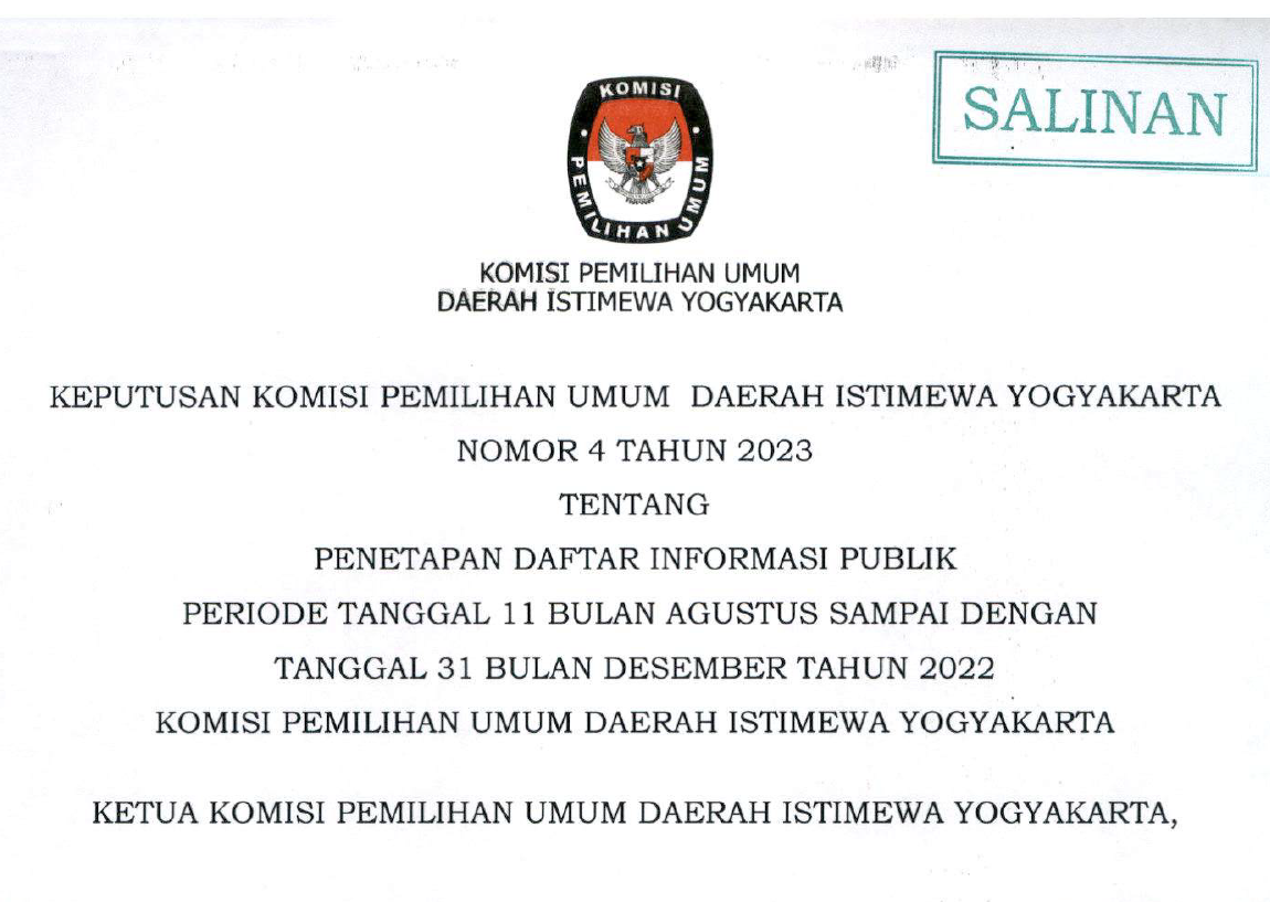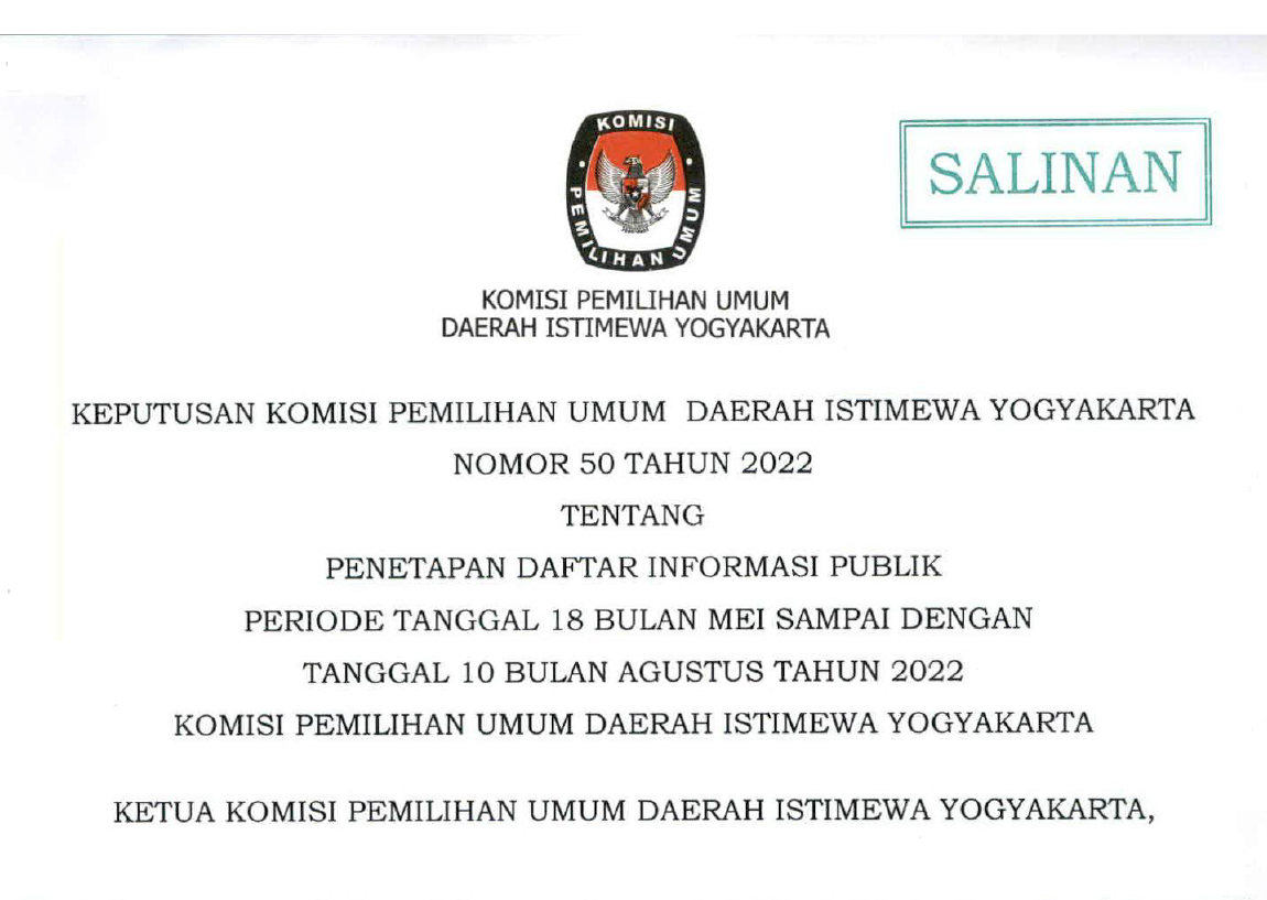 Penetapan Daftar Informasi Publik KPU DIY Periode 18 Mei - 10 Agustus 2022 Kamis, 01 September 2022 16:34 49 Keputusan KPU DIY tentang Penetapan Daftar Informasi Publik Periode 18 Mei - 10 Agustus 2022 dapat diunduh di sini. Baca Selengkapnya