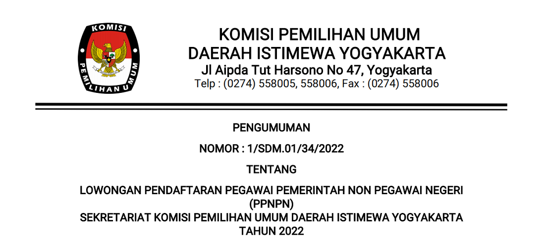 Pengumuman Nomor : 1/Sdm.01/34/2022 Tentang Lowongan Pendaftaran Pegawai Pemerintah Non Pegawai Negeri (PPNPM) Sekretariat Komisi Pemilihan Umum Daerah Istimewa Yogyakarta Tahun 2022 dapat diunduh di sini