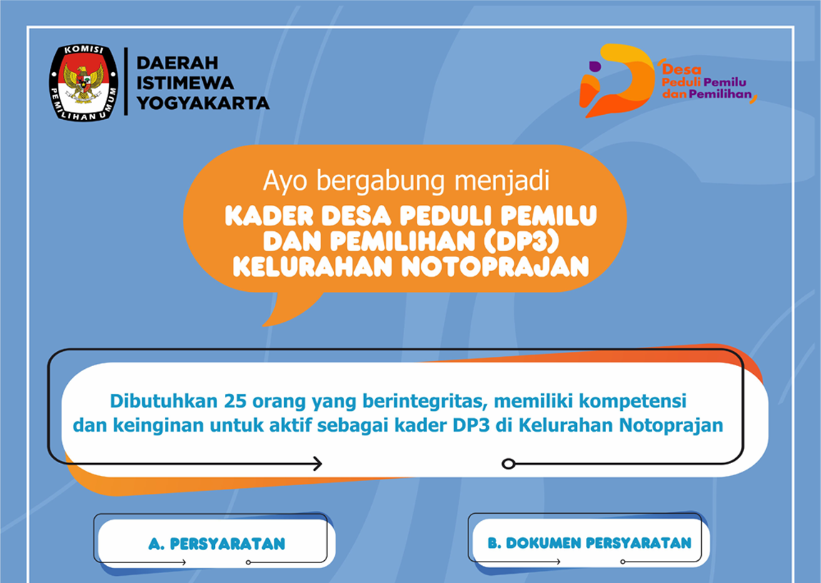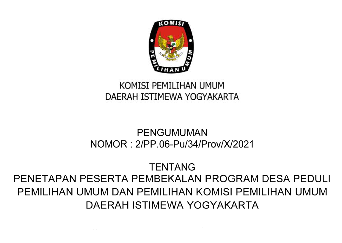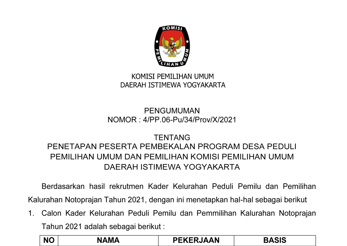 Pengumuman Penetapan Peserta Pembekalan Program Desa Peduli Pemilu dan Pemilihan (DP3) KPU DIY Kalurahan Notoprajan Kota Yogyakarta dapat diunduh di sini.