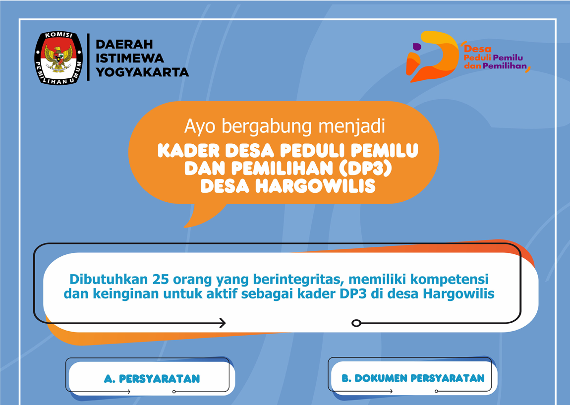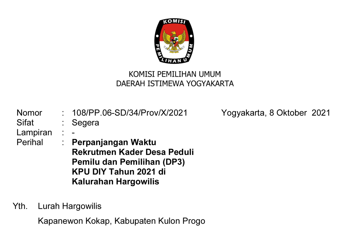 Perpanjangan Pendaftaran Kader Desa Peduli Pemilu dan Pemilihan (DP3) KPU DIY Desa Hargowilis Kabupaten Kulon Progo dapat dilihat pada surat KPU DIY Nomor 108/PP.06-SD/34/Prov/X/2021 yang dapat diunduh di sini.