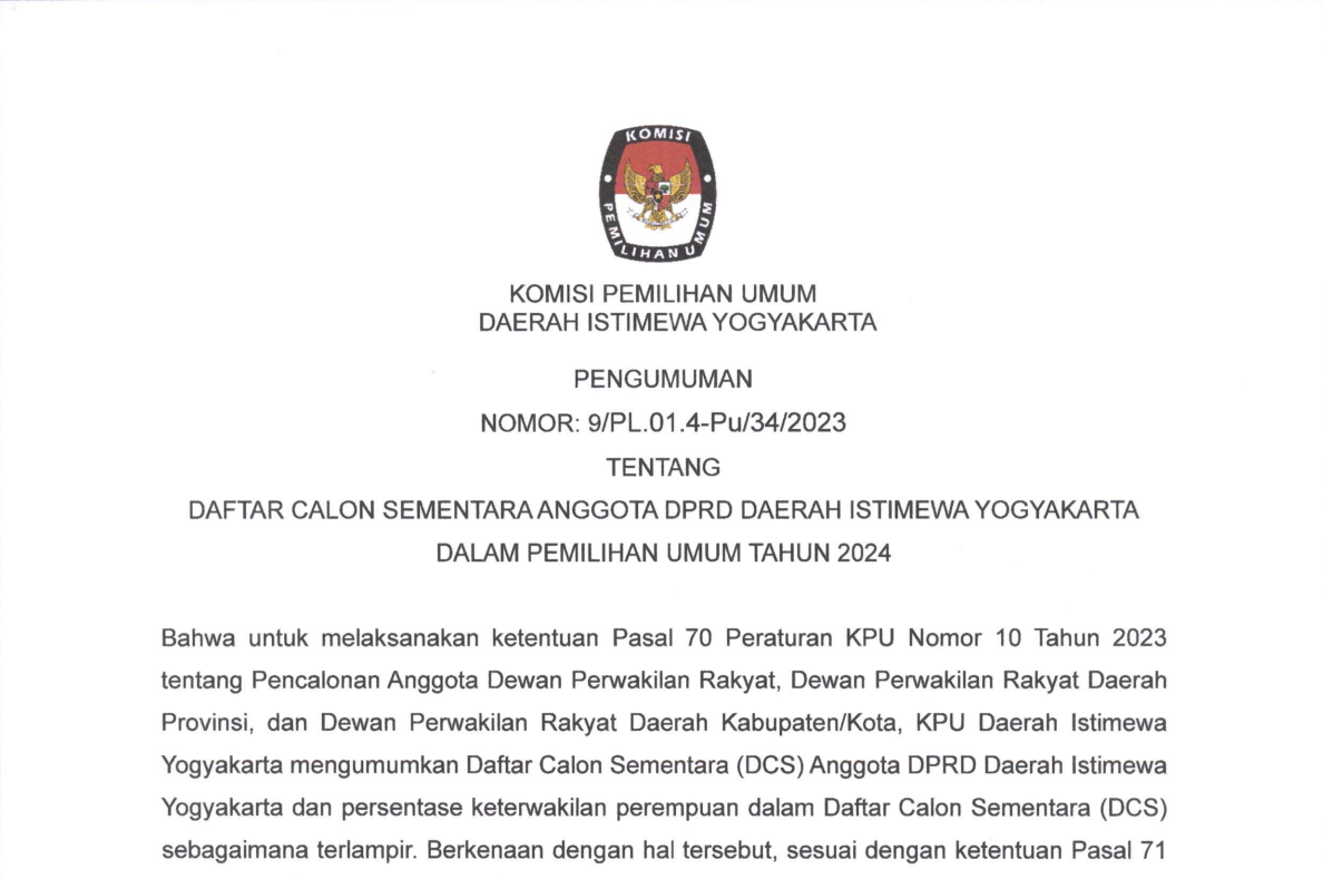 Bahwa untuk melaksanakan ketentuan Pasal 85 Peraturan KPU Nomor 10 Tahun 2023 tentang Pencalonan Anggota Dewan Perwakilan Rakyat, Dewan Perwakilan Rakyat Daerah Provinsi, dan Dewan Perwakilan Rakyat Daerah Kabupaten/Kota, KPU DIY mengumumkan Daftar Calon Tetap (DCT) Anggota DPRD Daerah Istimewa Yogyakartandan persentase keterwakilan perempuan dalam Daftar Calon Tetap (DCT).