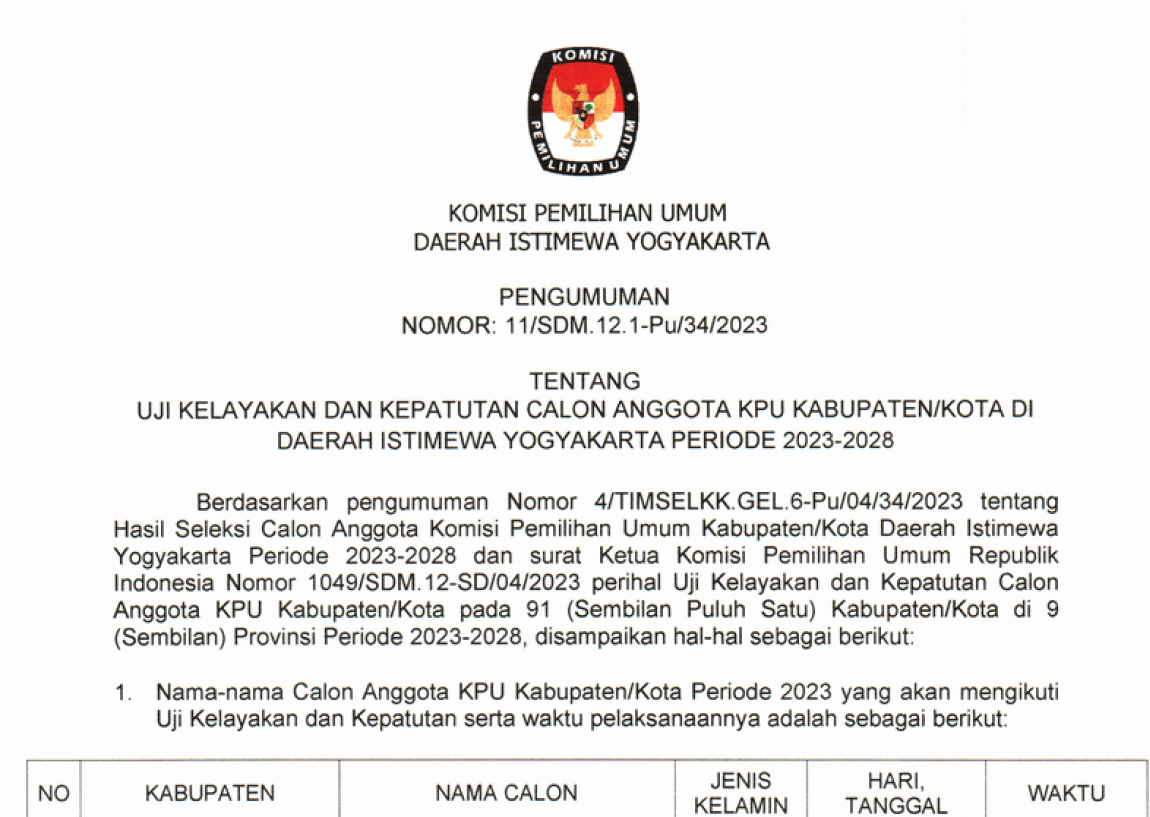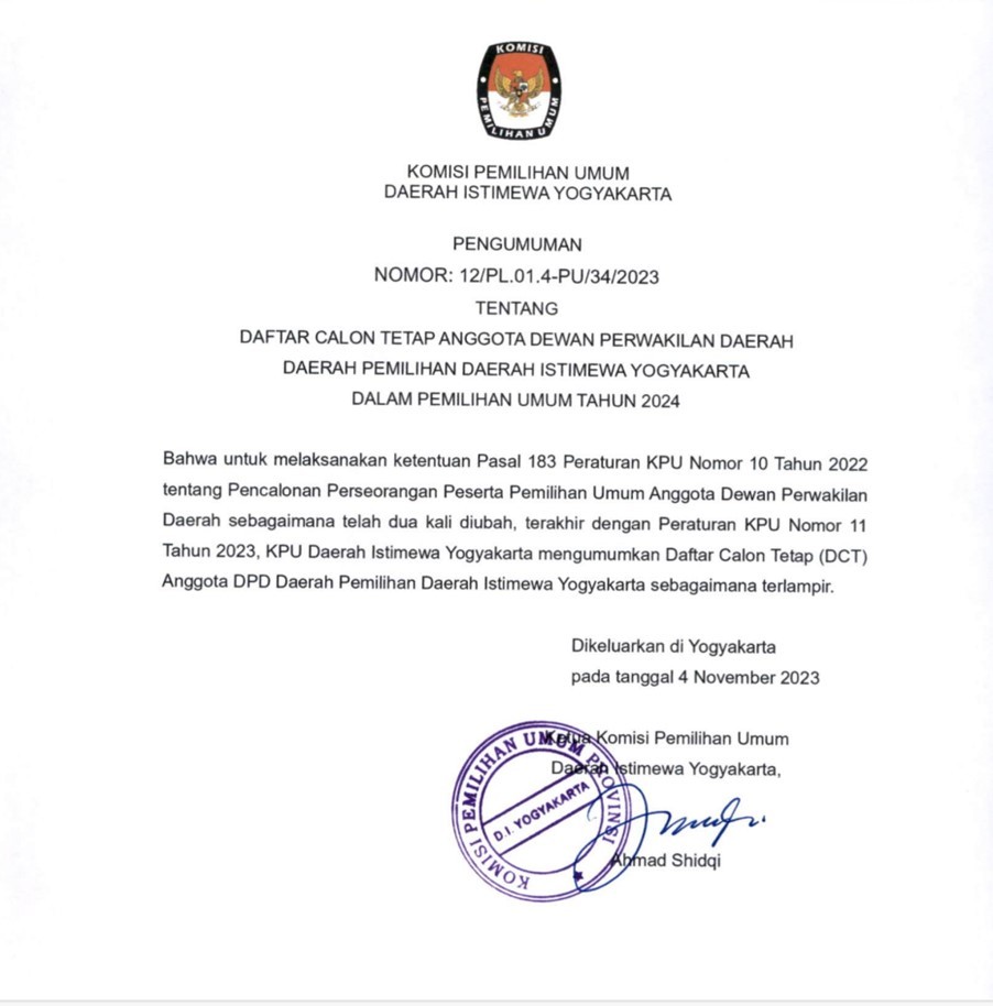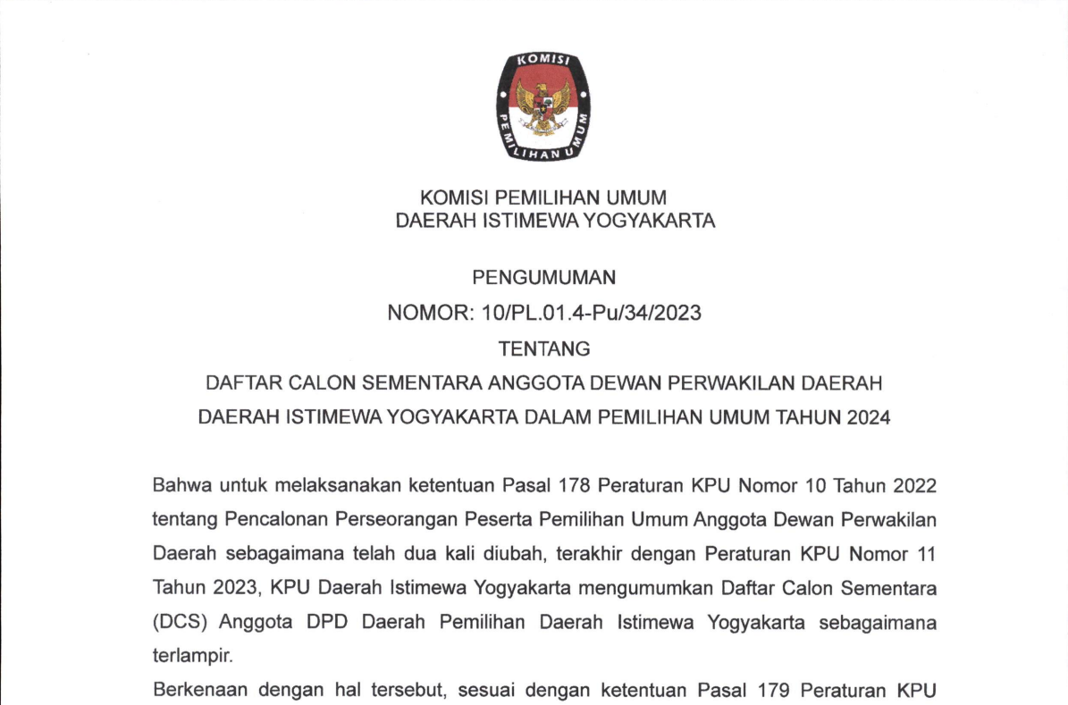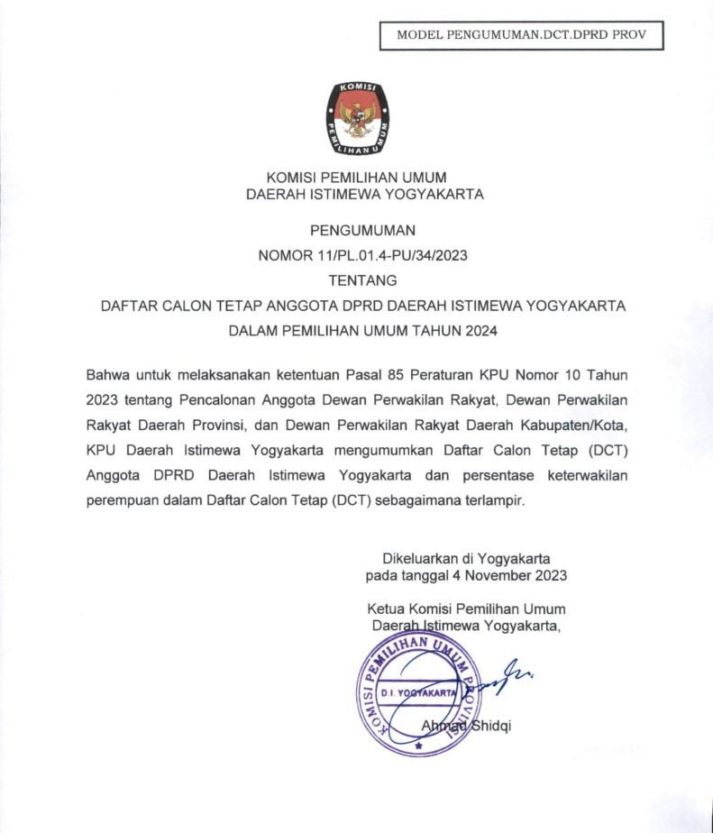 Pengumuman Daftar Calon Tetap Anggota DPRD Daerah Istimewa Yogyakarta dalam Pemilu Tahun 2024 dapat dilihat disini.