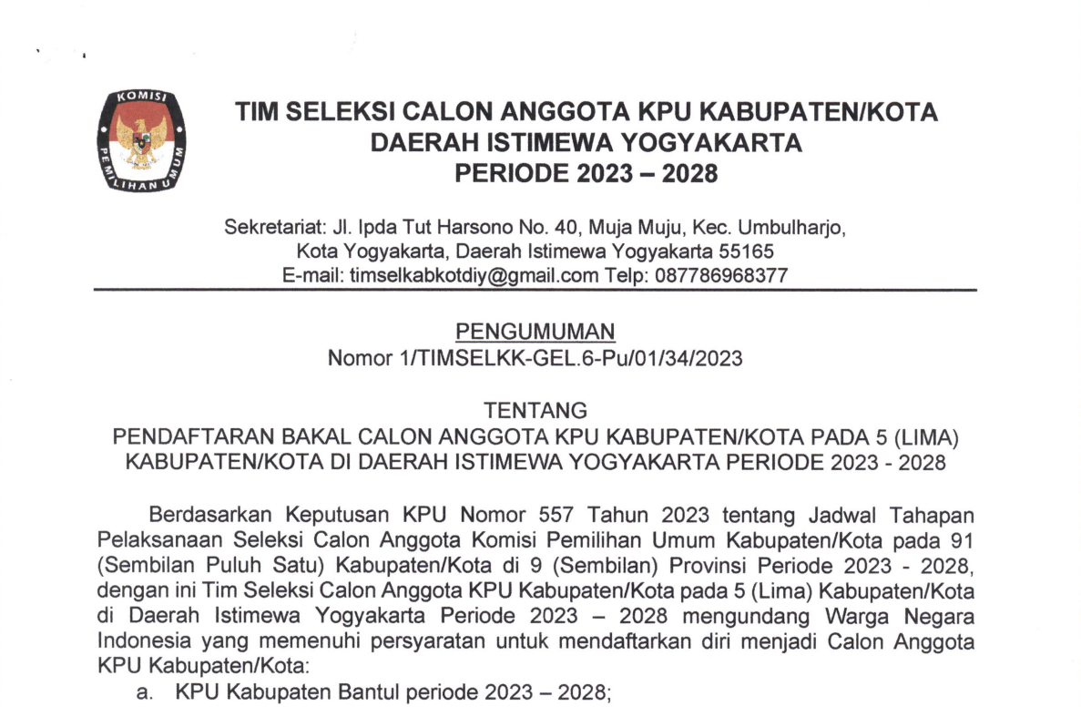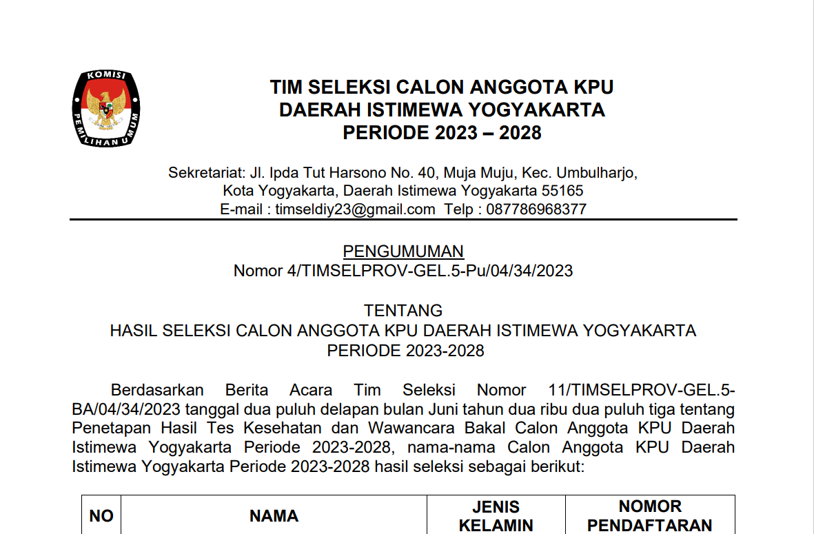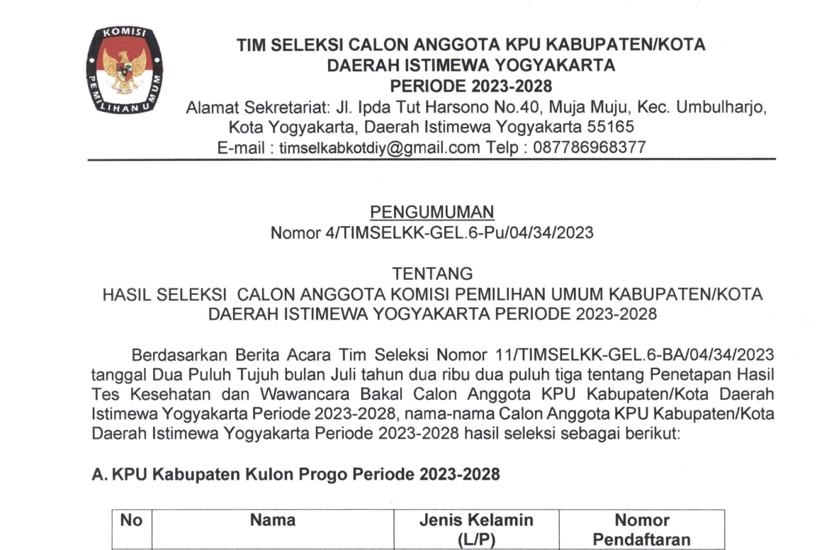 Pengumuman Nomor 4/TIMSELKK-GEL.6-Pu/04/34/2023 tentang Hasil Seleksi Calon Anggota KPU Kabupaten/Kota Daerah Istimewa Yogyakarta Periode 2023-2028 dapat dilihat disini