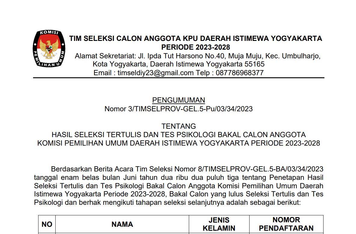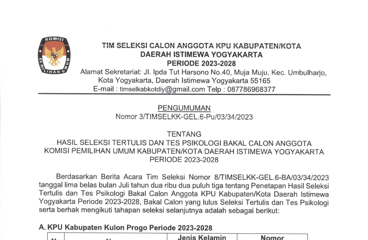 Pengumuman Nomor 3/TIMSELKK-GEL.6-Pu/03/34/2023 tentang Hasil Seleksi Tertulis dan Tes Psikologi Bakal Calon Anggota Komisi Pemilihan Umum Kabupaten/Kota Daerah Istimewa Yogyakarta Periode 2023-2028 dapat dilihat disini
