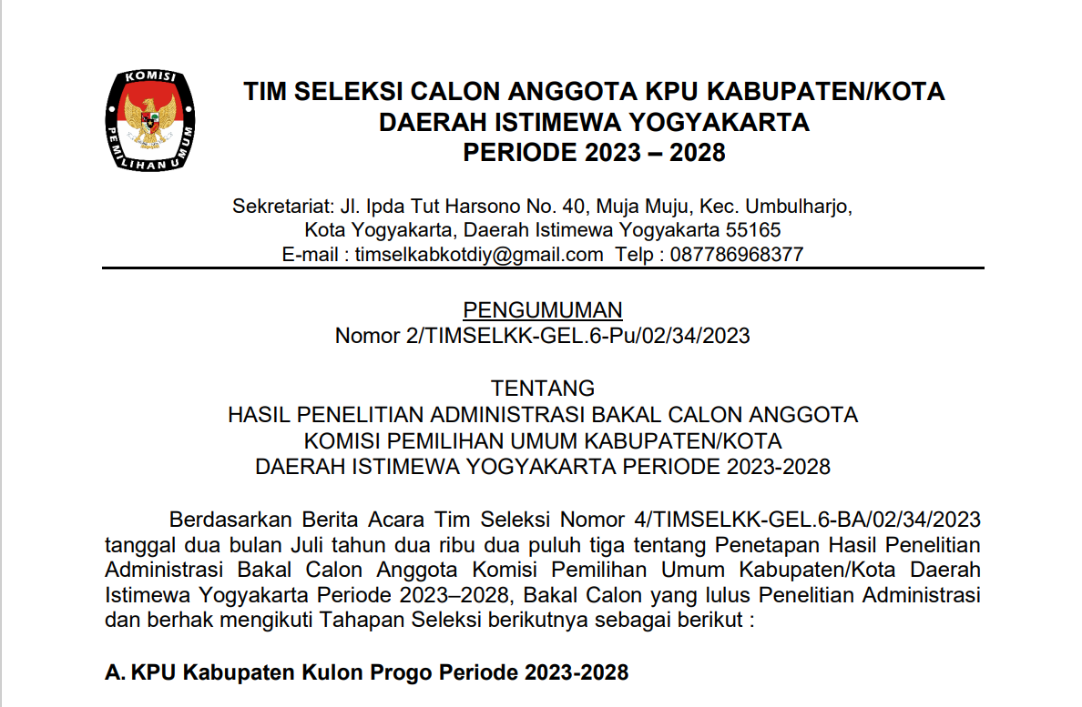 Pengumuman Nomor 2/TIMSELKK-GEL.6-Pu/02/34/2023 tentang Hasil Penelitian Administrasi Bakal Calon Anggota Komisi Pemilihan Umum Kabupaten/Kota Daerah Istimewa Yogyakarta Periode 2023-2028 dapat dilihat di sini