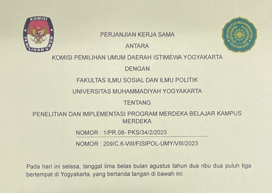 Perjanjian Kerja Sama antara KPU DIY dengan Fakultas Ilmu Sosial dan Ilmu Politik UMY Tahun 2023 Rabu, 16 Agustus 2023 16:44 106 Perjanjian Kerja Sama antara KPU DIY dengan Fakultas Ilmu Sosial dan Ilmu Politik UMY Tahun 2023 dapat diunduh di sini. Baca Selengkapnya