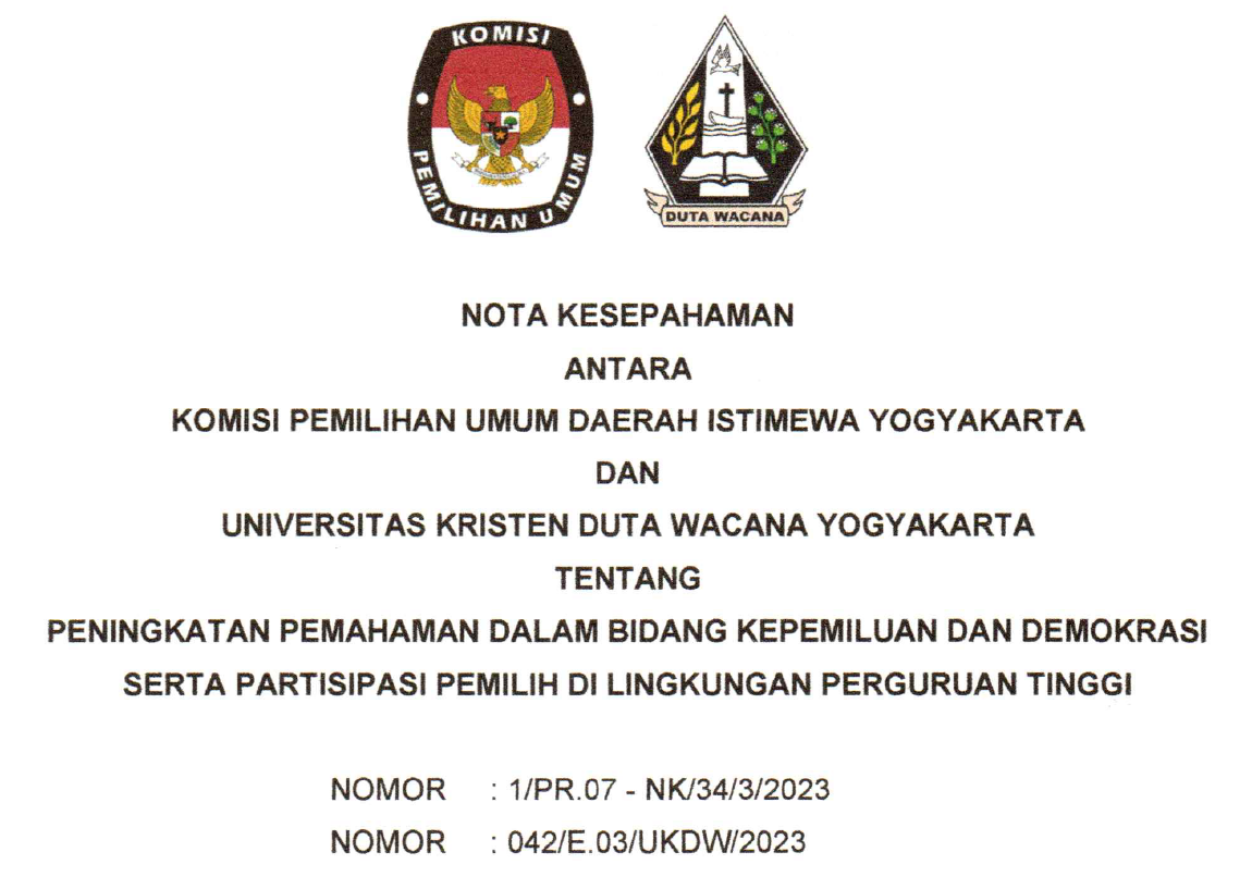 Nota Kesepahaman KPU DIY dan Universitas Kristen Duta Wacana Yogyakarta Tahun 2023 Jumat, 22 September 2023 16:33 78 Nota Kesepahaman KPU DIY dan Universitas Kristen Duta Wacana Yogyakarta Tahun 2023 dapat diunduh di sini. Baca Selengkapnya