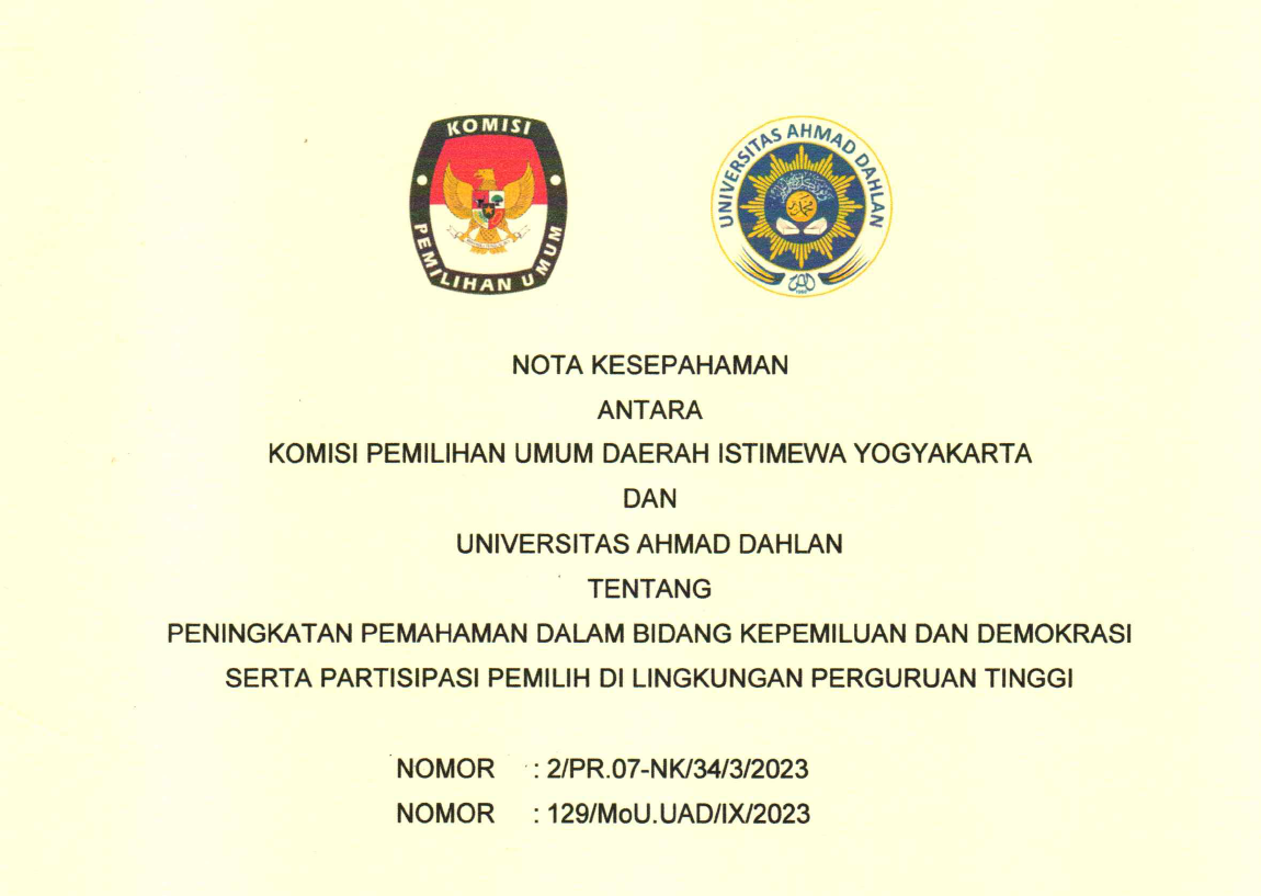 Nota Kesepahaman Antara KPU DIY dan Universitas Ahmad Dahlan Tahun 2023 Senin, 16 Oktober 2023 17:56 184 Nota Kesepahaman Antara KPU DIY dan Universitas Ahmad Dahlan Tahun 2023 dapat diunduh di sini. Baca Selengkapnya
