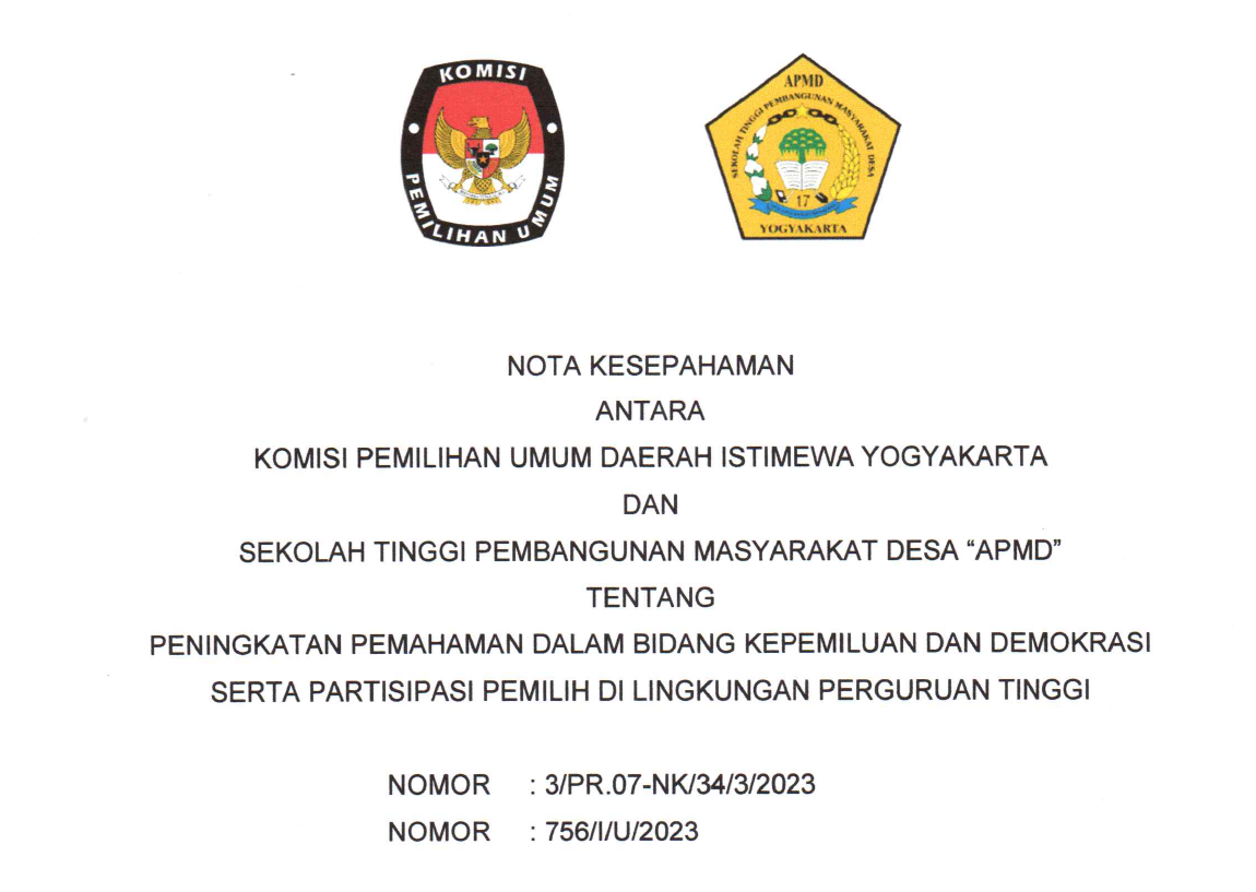 Nota Kesepahaman Antara KPU DIY dan Sekolah Tinggi Pembangunan Masyarakat Desa APMD Tahun 2023 Rabu, 18 Oktober 2023 16:00 161 Nota Kesepahaman Antara KPU DIY dan Sekolah Tinggi Pembangunan Masyarakat Desa "APMD" Tahun 2023 dapat diunduh di sini. Baca Selengkapnya