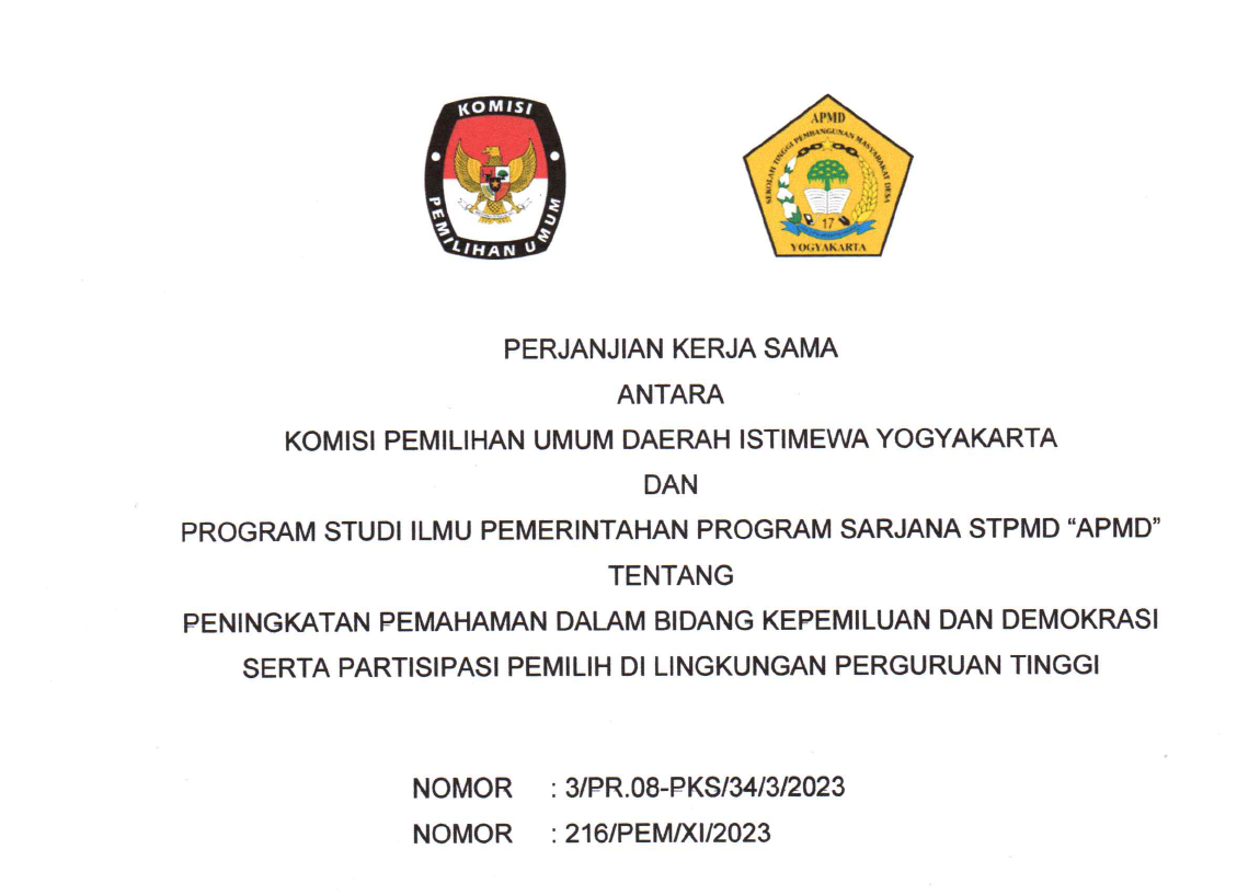 Perjanjian Kerja Sama Antara KPU DIY dan Program Studi Ilmu Pemerintahan Program Sarjana STPMD APMD Tahun 2023 Rabu, 18 Oktober 2023 16:35 462 Perjanjian Kerja Sama Antara KPU DIY dan Program Studi Ilmu Pemerintahan Program Sarjana STPMD 'APMD' dapat diunduh di sini. Baca Selengkapnya
