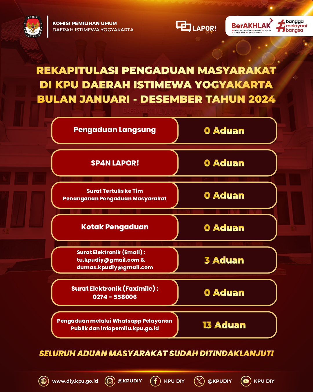 Seluruh aduan masyarakat yang berkaitan dengan penyelenggaraan Pemilu di wilayah KPU DIY telah direspon dan ditindak lanjuti sesuai dengan SOP yang berlaku. Semangat KPU DIY dalam merespon pengaduan masyarkat adalah bentuk kepedulian dan tanggung jawab kepada masyarakat.