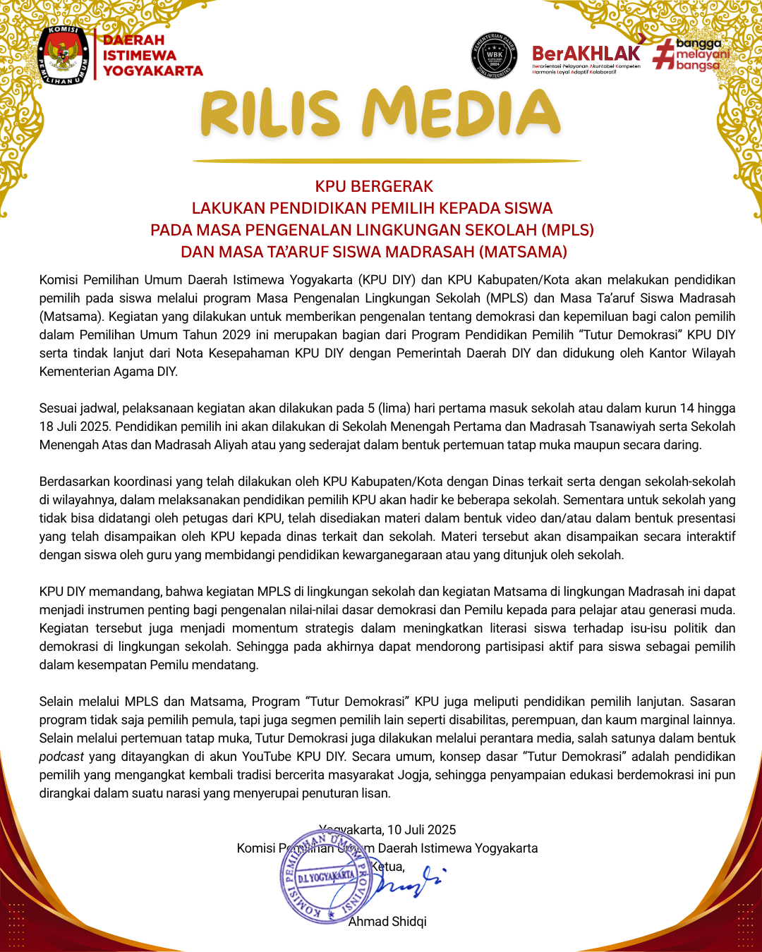 Rilis Media "KPU Bergerak Lakukan Pendidikan Pemilih Kepada Siswa pada Masa Pengenalan Lingkungan Sekolah (MPLS) dan Masa Ta’aruf Siswa Madrasah (Matsama)" dapat di unduh di sini